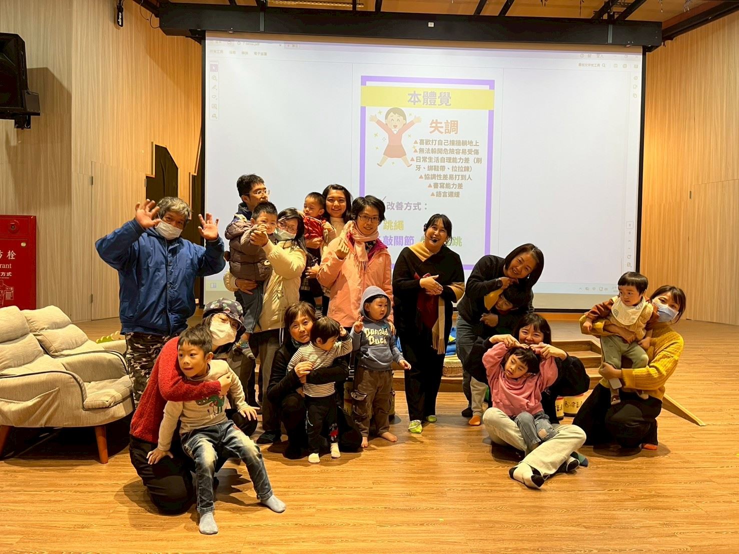 吳老師透過親子互動方式教導家長在日常生活中利用簡單器材(如絲巾、彈力繩等)進行全方位的感官訓練,引導家長在遊戲中自然帶動孩子的感官發展。緊接著活動進入美國 Music Together 音樂遊戲課程,透過節奏明快的韓國鼓與繽紛的星星氣球傘,營造出豐富的感官環境,讓孩子在充滿樂趣的音樂治療氛圍中,同時訓練手眼協調與前庭空間感。