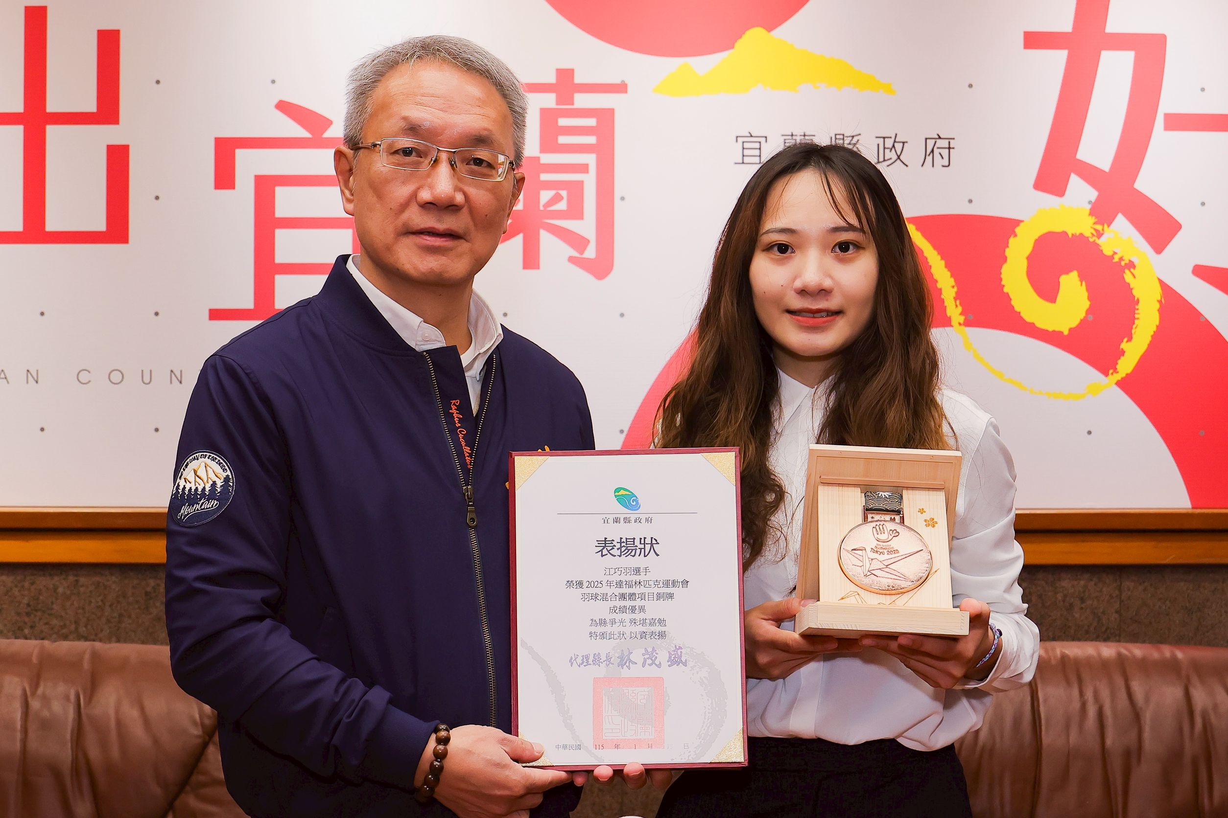 宜蘭縣籍羽球好手、目前就讀國立清華大學碩士班的江巧羽選手,代表國家參加「2025年達福林匹克運動會(聽障奧運)」,在強敵環伺的羽球混合團體項目中展現精湛球技,成功勇奪銅牌殊榮。為表彰其優異表現,林茂盛代理縣長今(13)日接見江巧羽選手,對於她為國爭光、榮耀宜蘭的傑出成就給予高度肯定與祝賀。