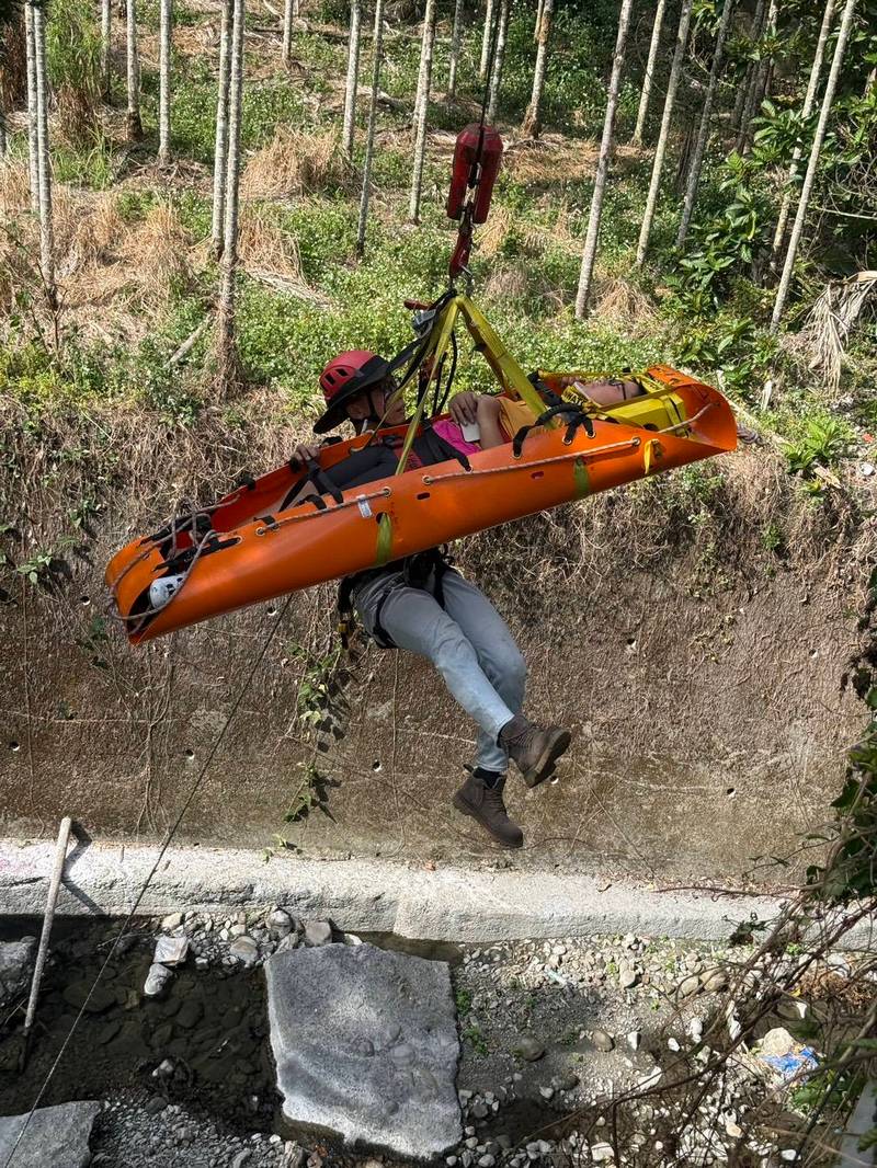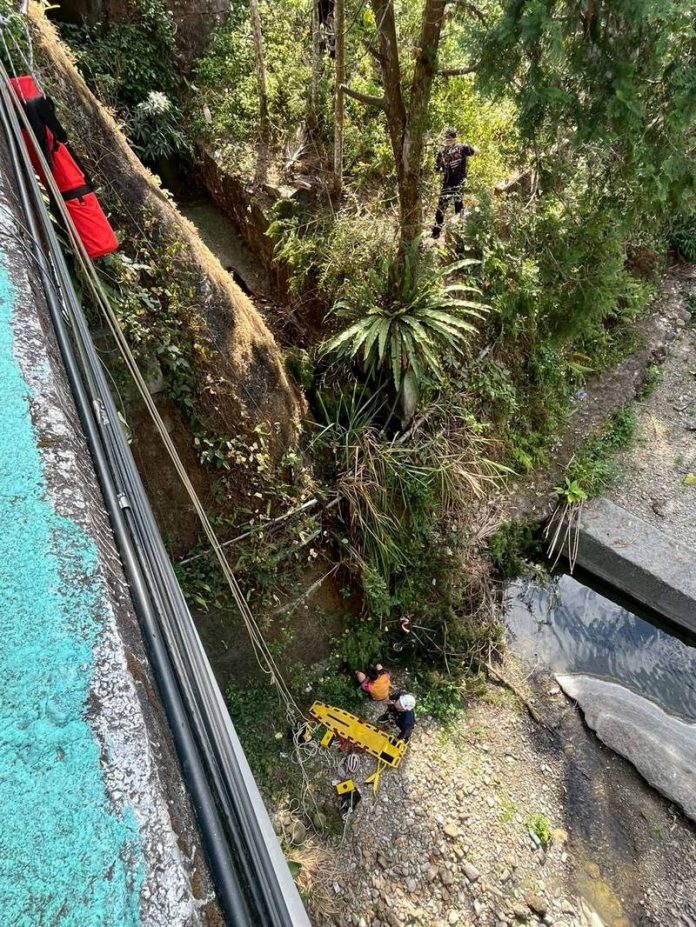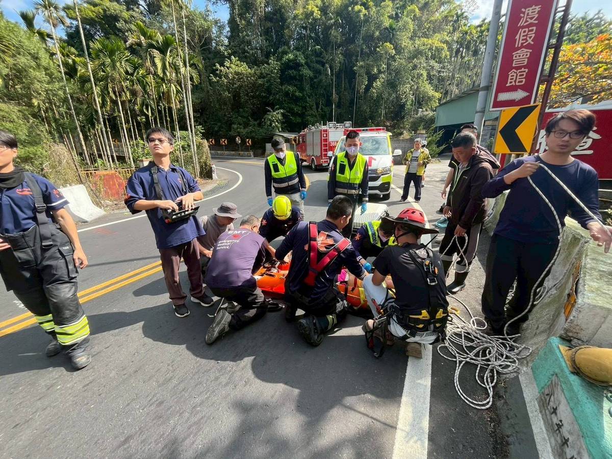 同時上方路面亦進行拖拉系統架設,待傷患處置及固定完備後,準備將傷患用省力拖拉系統將其上拉,等待傷患打包過程,埔里12及中心碑71由王繼增分隊長帶班抵達現場,為考量現場環境地形與拖拉作業之便利性,無縫接軌決定由中心碑71取代傷患及救助手上拉作業,於11時25分將傷患安全順利吊掛於路面交由91車人員後送埔里榮民醫院,現場人員、裝備器材清點後返隊,現場交由員警處理後續事宜。