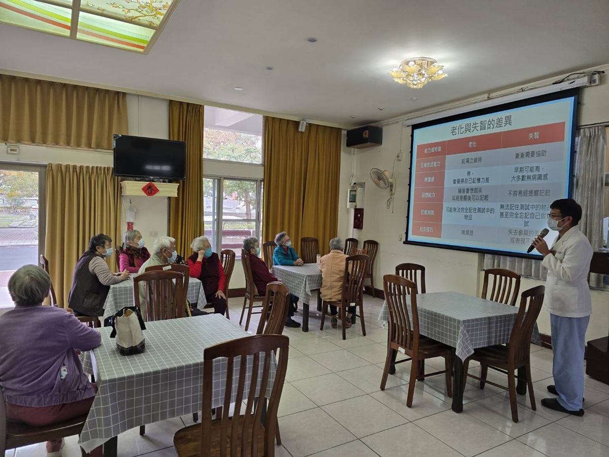 吳俊遠醫師說明了失智症的定義與類型,包含阿茲海默症、血管性失智症等常見形式,並介紹其病程發展、常見症狀與早期警訊,如記憶力衰退、判斷力下降、情緒與行為改變等,協助住民提升對失智症的辨識能力。同時,吳醫師也說明可能的危險因子,包括高齡、慢性疾病、不良生活習慣及社交刺激不足,並進一步分享日常生活中可行的預防照護方式與疾病治療方向,如規律運動、健康飲食、腦力訓練及維持良好社交互動,強調早期發現與持續關懷對延緩病程的重要性。