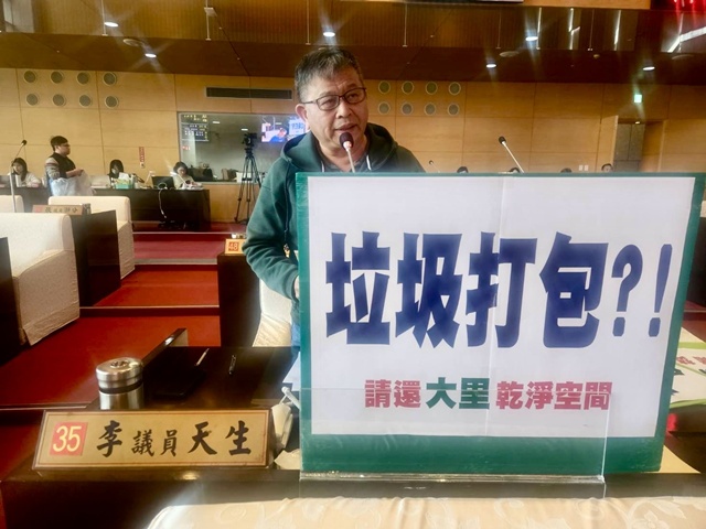 李天生指出,大里垃圾山堆置垃圾約四十萬噸,市府執行一般廢棄物分選打包計畫,預計處理八萬噸,不過在試運轉十天後遭民眾抗議暫停運作,地方抱怨,將大量垃圾堆在大里垃圾場,製造汙染,同時花費上億元經費也只打包八萬噸垃圾,大里不知道何時才能擺脫垃圾的夢饜,擁有乾淨的生活空間。