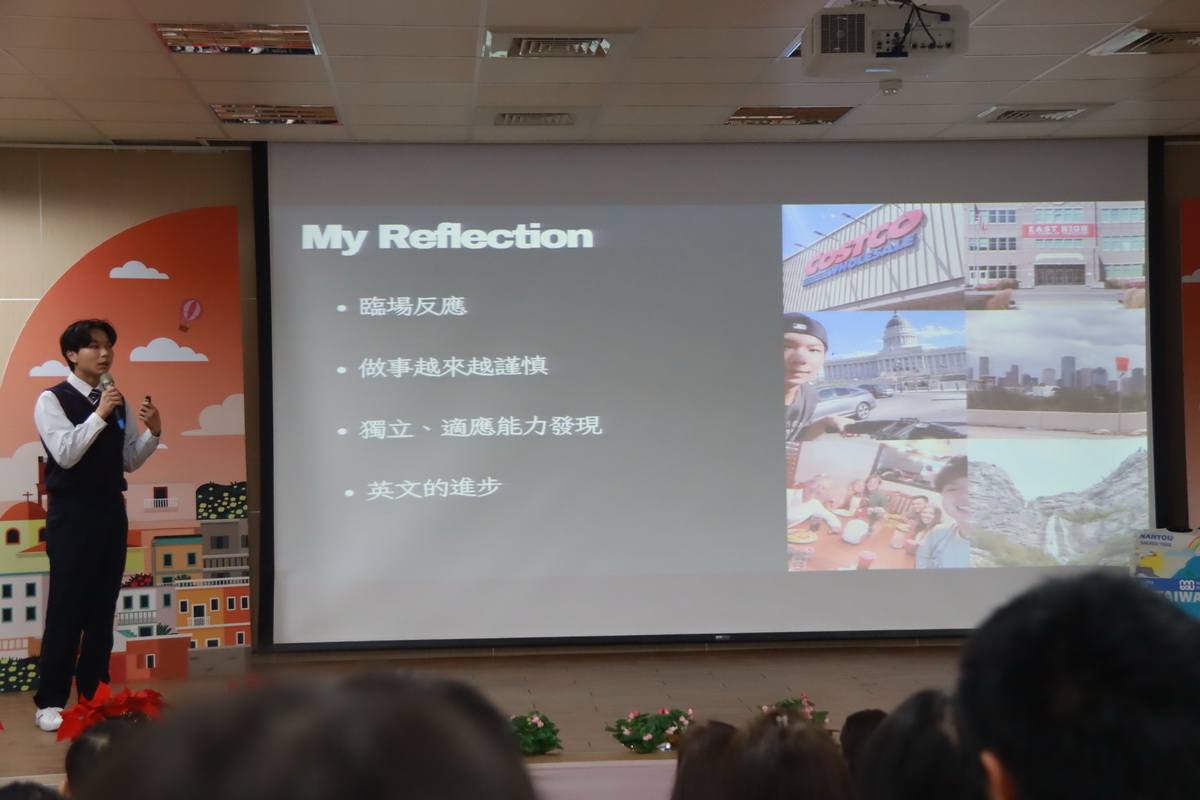 成果發表會由旭光國標舞社及虎山國小英語相聲表演揭序幕,接續旭光高中賴冠程分享赴美德州語言學校,說明自己能適時調整融入當地的生活,強化臨場反應,更有自信,可充分使用英文自然與人交流,包容心變強,感謝南投縣府給予機會一圓兒時夢想。