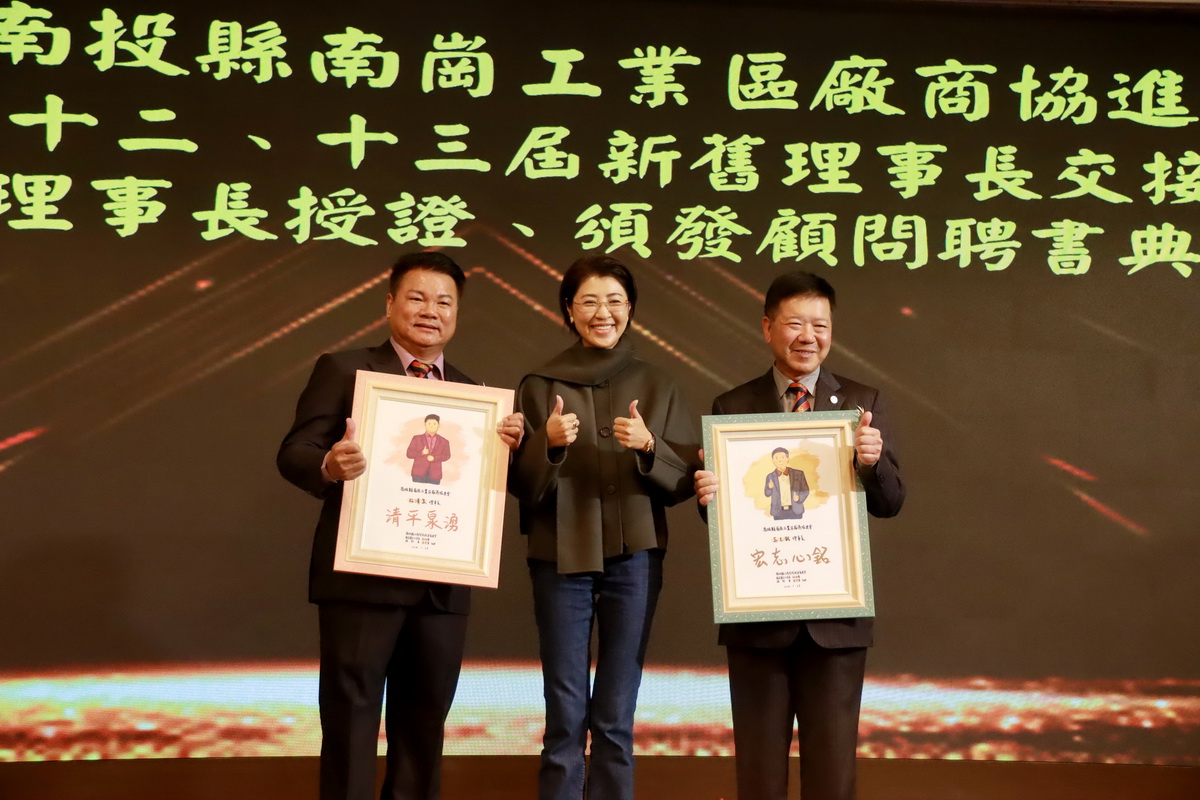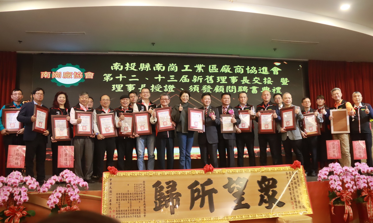 南投縣南崗工業區廠商協進會第12、13屆理事長交接典禮,23日在南投市南島婚宴會館盛大舉行。南投縣長許淑華出席監交印信並予祝賀,感謝卸任理事長粘清泉4年來對協會的卓越貢獻,同時期許新任理事長高志銘,帶領協會持續強化會員服務,協助產業因應國際貿易挑戰,積極朝智慧製造與低碳永續發展邁進。