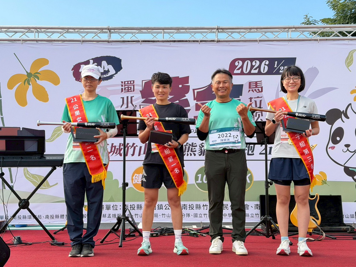「2026濁水溪紫金馬拉松-花城竹山站x熊貓黑白跑」25日於南投縣竹山鎮公所前廣場舉行,1500餘名國內外跑者齊聚竹山,清晨在鳴笛聲中正式起跑,現場氣氛熱絡。竹山鎮公所特於24日晚間舉辦一場選手之夜歡迎國內外各地選手的參與,鎮長陳東睦歡迎大家來竹山體驗竹山的人情味與文化。