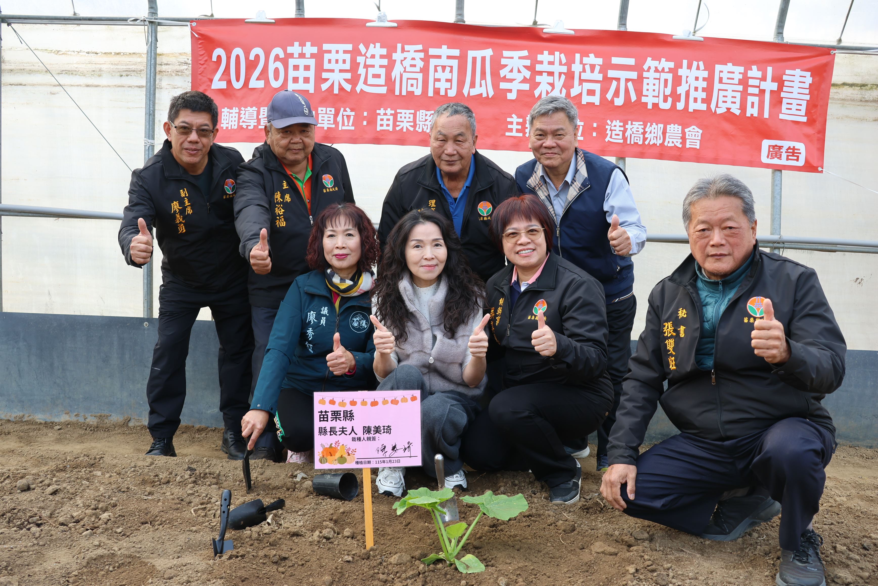 造橋鄉農會1月23日舉辦苗栗造橋南瓜季栽培示範推廣計畫,縣長夫人陳美琦前往牛奶故鄉種植超大南瓜,為5月9、10日南瓜季活動暖身,夫人感謝農民的用心與付出,強調縣府會繼續以實際行動陪伴農民,透過輔導、品牌推廣讓在地農業能夠穩定發展,讓農民更有信心,年輕世代回鄉投入農業,讓苗栗的農村保更有活力更有價值。