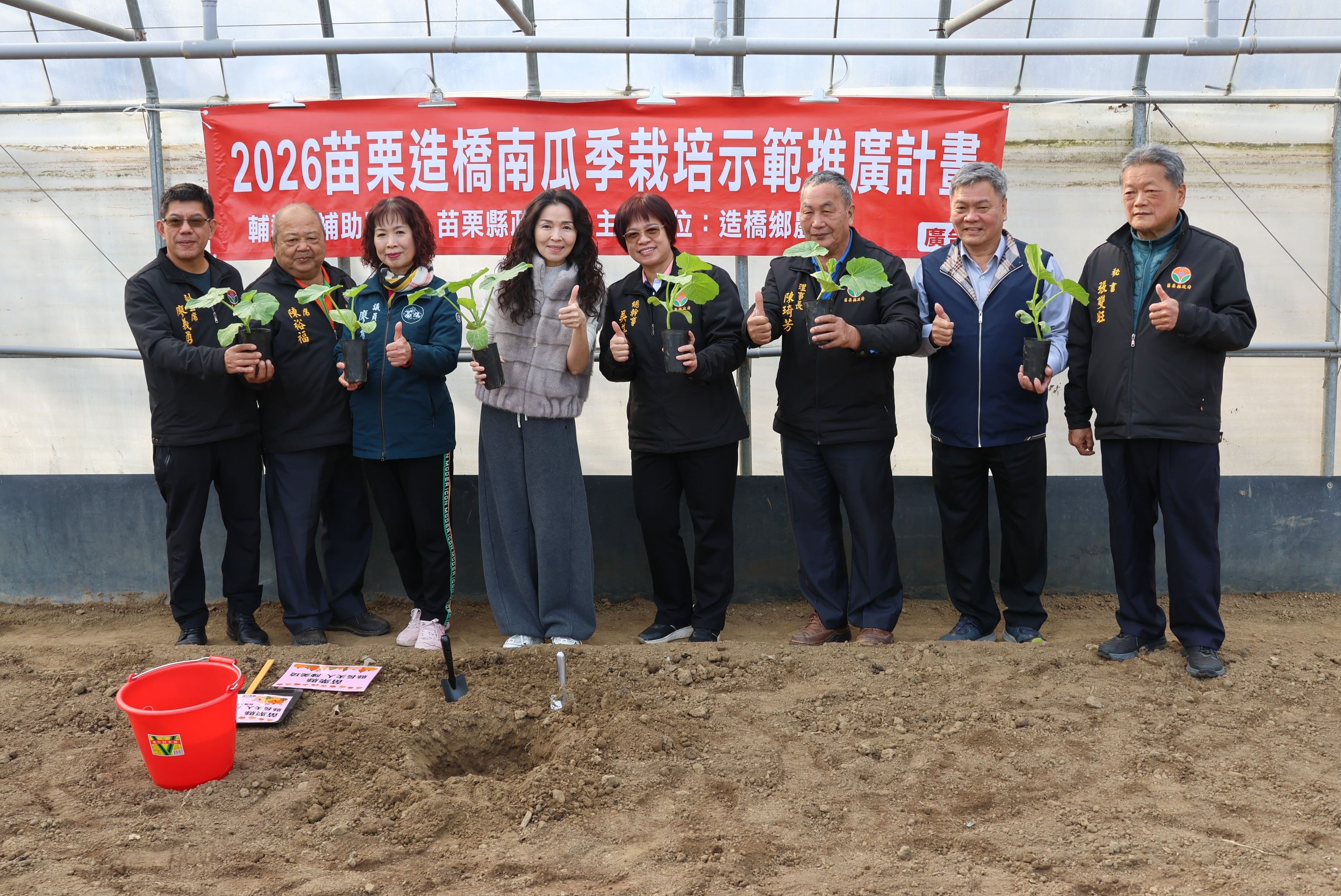 農會總幹事吳美慧表示,造橋南瓜季今年邁入第18年,目前南瓜種植面積逾10公頃、品種達5種以上,今年1月多共發出2萬株苗開始栽種食用南瓜,南瓜季活動將於5月9、10日,今天種下大南瓜,期望屆時能長大到500斤。理事長陳琦芳說明,大南瓜栽種仰賴水分、溫度的專業管理,而食用南瓜預計4月份推出,觀賞用南瓜將於2月中旬之後開始種植,將打造100公尺的南瓜隧道。