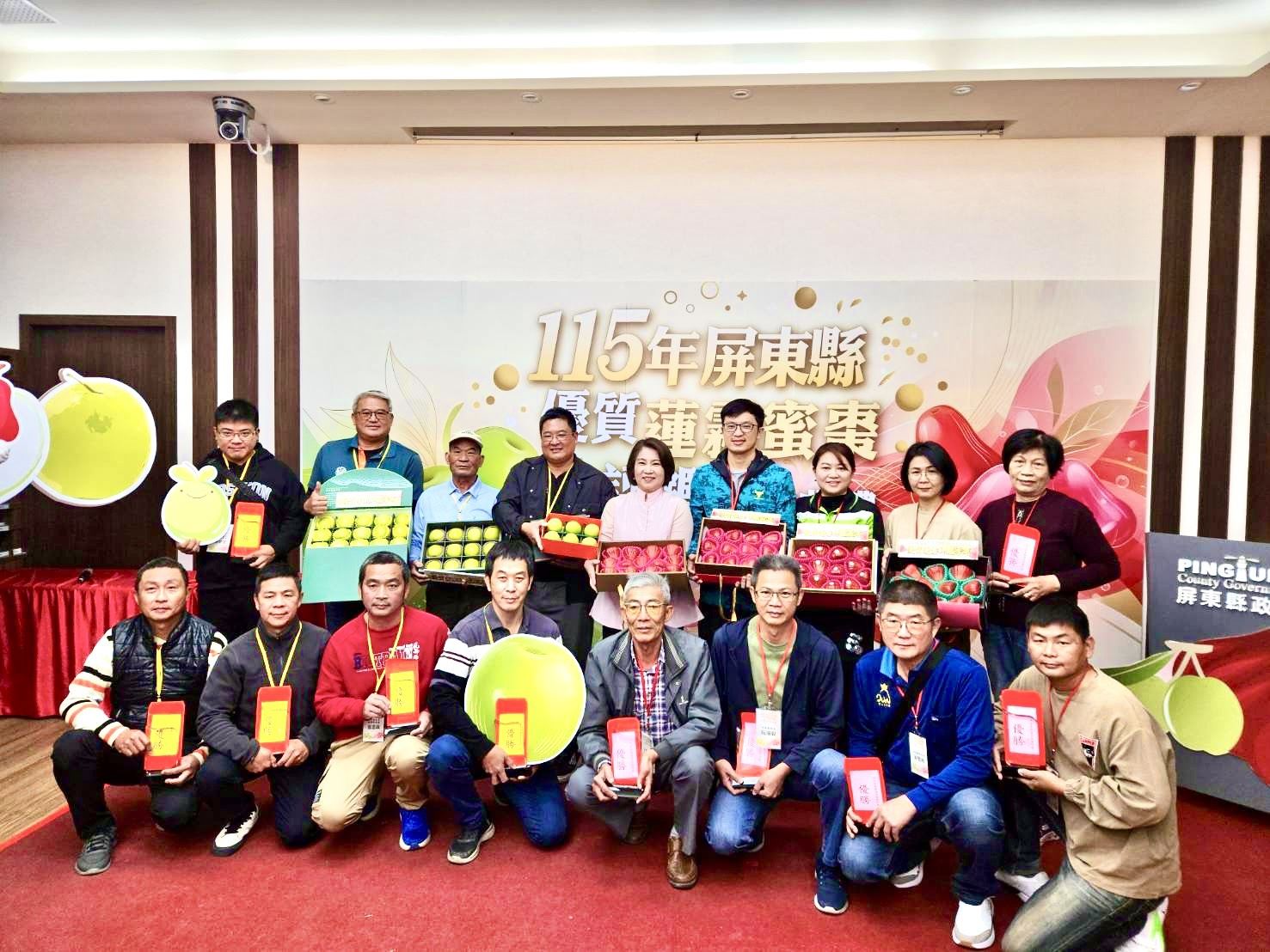 為選拔屏東縣當季最優質的蓮霧與蜜棗,屏東縣政府舉辦「115年屏東縣優質蓮霧、蜜棗評鑑」,今年共吸引蓮霧組39組、蜜棗組27組農友報名參加,於1月22日完成評鑑作業,最終由農友黃國霖勇奪蓮霧組冠軍、潘志民獲得蜜棗組冠軍。縣府今(23)日舉行頒獎典禮,縣長周春米頒獎表揚,並表示縣府依產期辦理果品評鑑,除強化果品品質、建立分級包裝觀念,也同步提升屏東蓮霧、蜜棗的市場價值,成為年節送禮的優質首選。