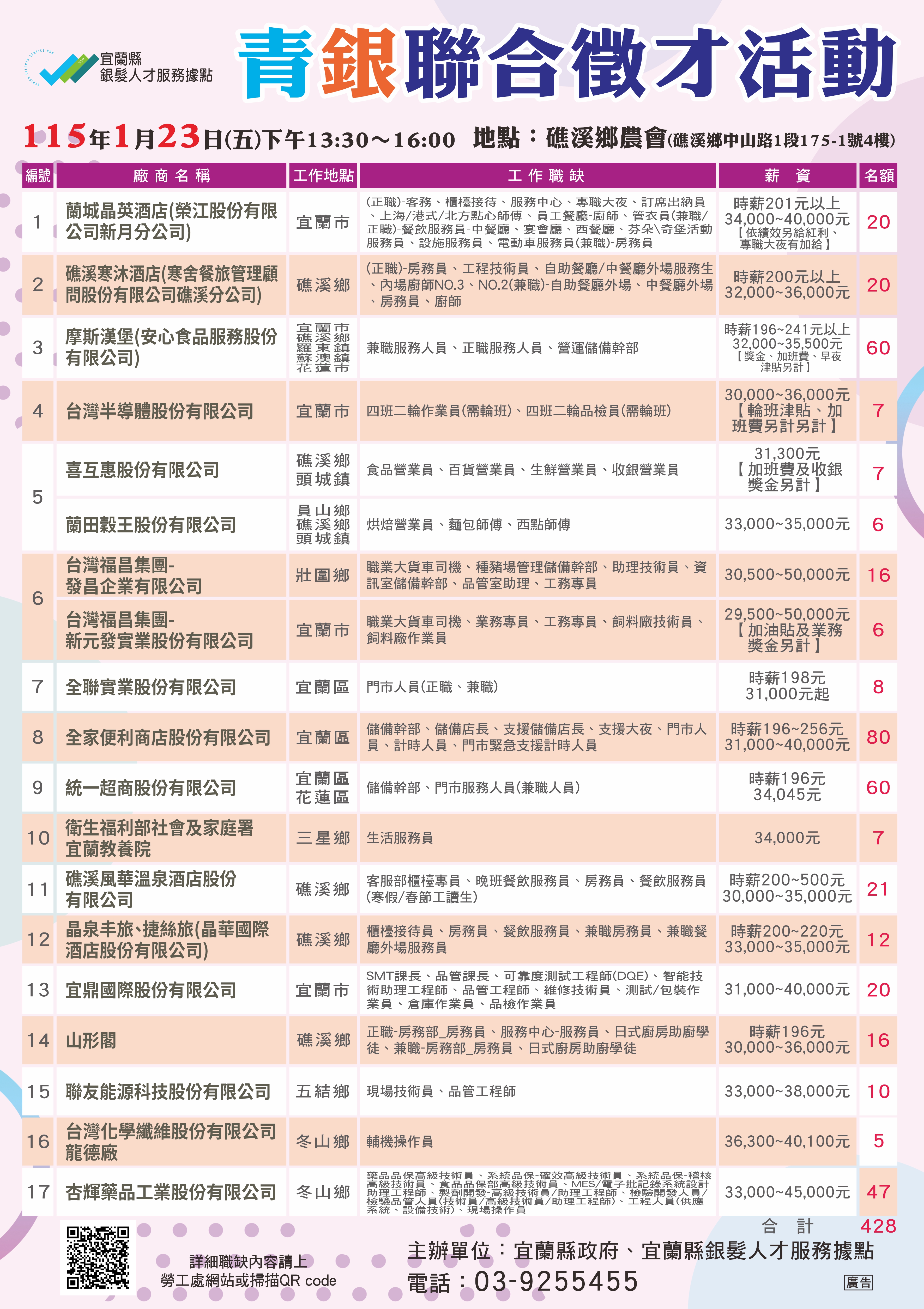 本次聯合徵才廠商包含餐飲業、服務業、零售業、旅宿業、長期照顧服務業及傳產及製造業等縣內優質廠商,其中部分廠商有提供多元彈性工作時間之職務,吸引中高齡者及高齡者重返職場,充實企業勞動力,並期盼透過青銀共事,為企業創造多元新價值。