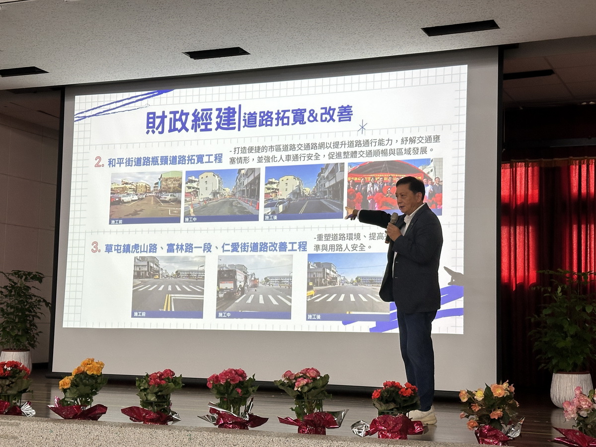 在文化與休閒建設上中山運動公園整建、酷比公園周邊環境改善工程,規劃建置草屯新地標-演藝中心天幕工程持續推動,強化草屯藝文展演與休憩機能;活絡鎮有資產部分也將演藝中心成功招商活化利用、市場管理成效獲中央肯定榮獲四星優良市集、嘉老山示範公墓2樓納骨櫃位銷售也在114年11月下旬開賣後一個多月為公所進帳1億500多萬餘元,不僅各項政策推動符合鎮民需求並帶來豐富財源收入。