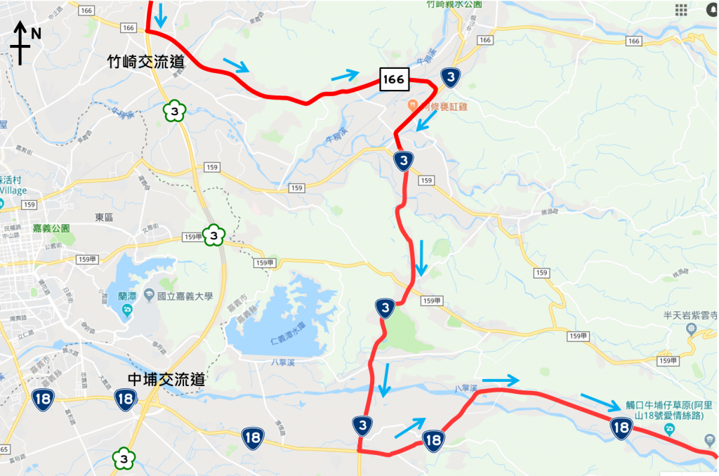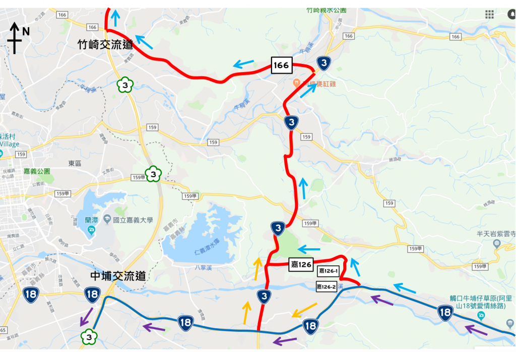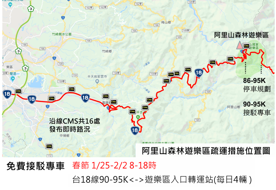 公路局雲嘉南區養護工程分局表示,連假期間「台18線中埔、石棹及阿里山森林遊樂區路段」可能出現車多情形,因山區路段停車位有限,建議民眾搭乘大眾運輸提 昇旅遊品質。台18線中埔-頂六路段常因下山車流集中、國道匝道儀 控管制造成車多,交通部公路局雲嘉南區養護工程分局提供上山及下山2條替代路線,建議下山後使用國道3號北上的民眾可行駛替代路線轉往國道3號竹崎交流道;國道3號南下車輛亦可提早下竹崎交流道行駛替代路線前往奮起湖、阿里山方向;「台3線266K-269K梅山路段」因受號誌影響,於2月17日至2月20日11-13時(南下)及16-18時(北上)也可能出現車多的情形。