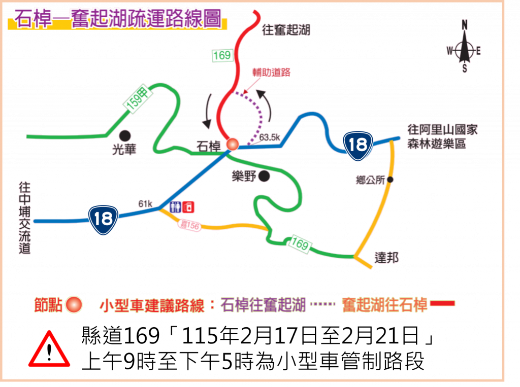 阿里山國家風景區管理處將依往例於春節期間(2/17-2/21 9-17 時)針對石棹往奮起湖(縣道169)實施小車單向管制,前往奮起湖車輛由台18線63.5K 處行駛頂石棹輔助道路、轉169線往奮起湖,回程則行駛169線往石棹;請民眾行經該路段時,遵守現場管制小心慢行,或可至61K 停車場(樂野服務區)停車後搭乘接駁專車前往奮起湖。