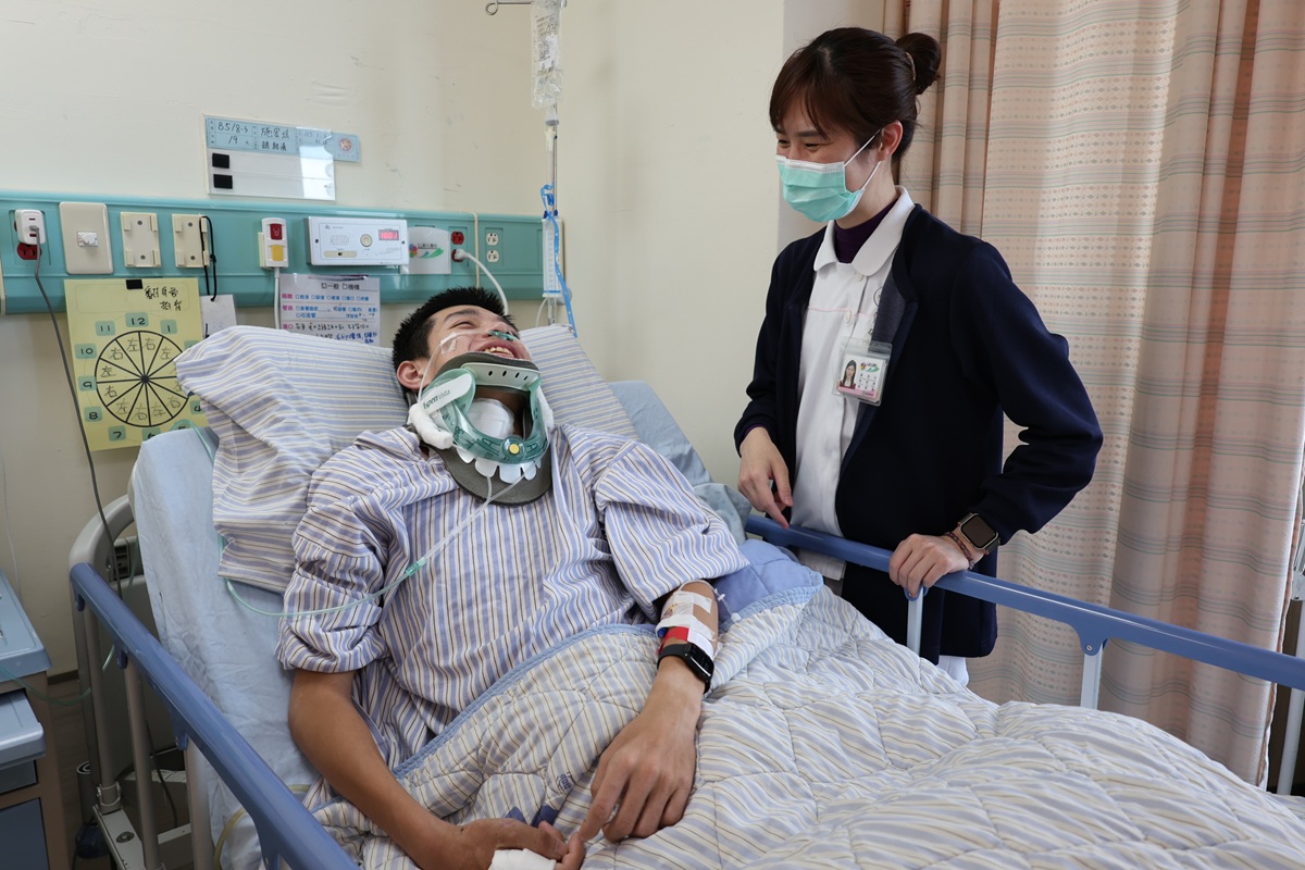 施姓男學生說話無力,但他還是堆滿笑容地說,休學返家後在一家健身房工作,同時自讀準備報考警大,沒想到出了意外,只能正面以對。躺在病床上的他,在物理治療師、職能治療師、語言治療師的協助下,努力地復健。趙紹清誇他長得像中國影星宋威龍,逗他笑得合不攏嘴。醫護人員也都很喜歡他,讚賞他傷勢嚴重,依然保持一貫的樂觀與笑容,互動融洽,病房常傳出笑聲。