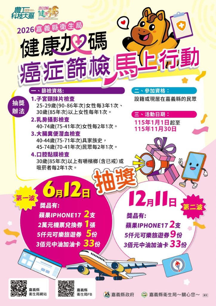 嘉義縣衛生局說,獎項包含最新iPhone 17、2萬元機票兌換券及各式禮券,鼓勵鄉親馬年開始一起為自己健康加碼,用實質健檢行動,攜手與家人為自己的健康加分。