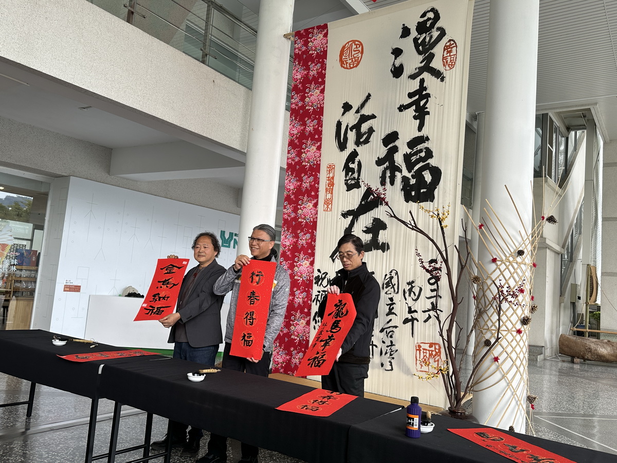 農曆春節是民眾踏青、迎接新年的最好時節,國立臺灣工藝研究發展中心2026年農曆春節期間特別策劃「攏馬有春」系列活動,8日下午邀請12名縣內著名書法名家來現場揮毫贈春聯,特別的是此次使用的是稻草製的筆,工藝中心主任陳殿禮、葉志誠、林戊震等三位率先開筆,寫下納福得福幸福祝福語。