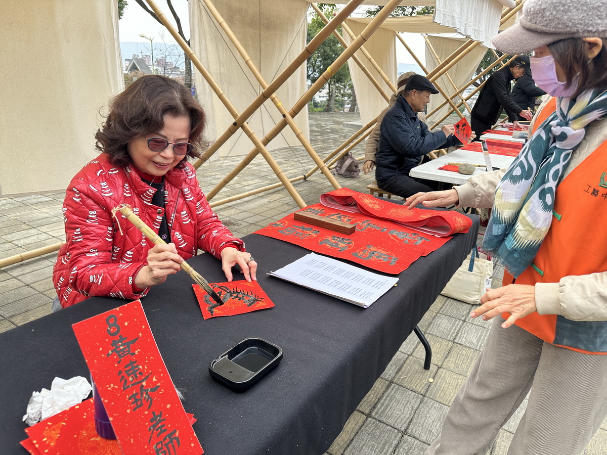 延續迎春氛圍工藝中心8日辦理「2026漫幸福・迎春賀歲—春聯揮毫」,邀請12位書法名家現場揮毫,免費寫贈春聯為新的一年帶回滿滿祝福。會場並有工藝好市展售。參與的陳恒聰校長首度接受稻草筆考驗,覺得很有趣。