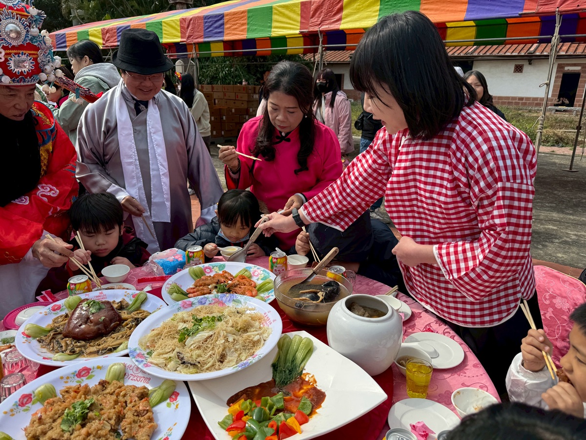 家扶基金會董事林條金、益源古厝第七代長孫陳邦弘與家扶中心主任敲鑼、擊鼓,宣布活動正式開始,現場由貴賓們端上熱騰騰的豐盛年菜,邀請家扶兒一起享用,六道年菜有古早味佛跳牆、雙蔘燉烏雞、櫻花蝦米糕、無錫排骨、蒜味河粉鮮蝦、富貴金絲元蹄,道道色香味俱全,不僅暖胃,更溫暖人心,吃飽後由貴賓發放紅包,孩子開心地收下滿滿祝福,洋溢幸福笑容。