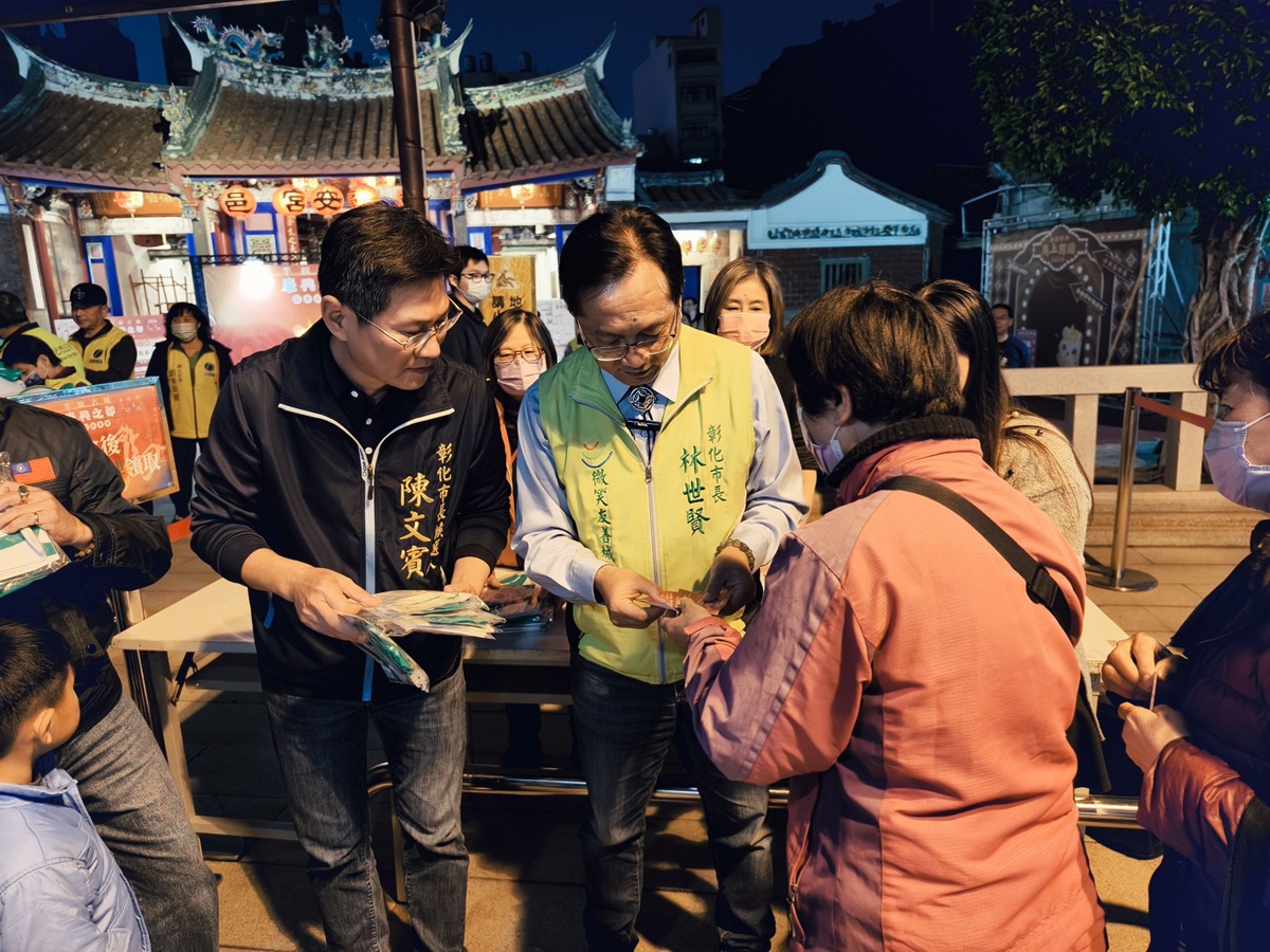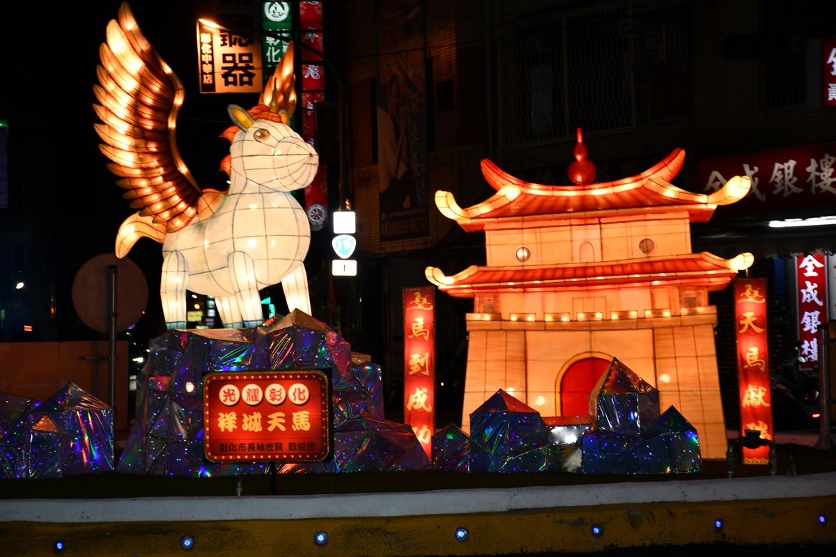 林世賢市長10日晚上6點在慶安宮由主持隆重的點燈儀式,全市沿永樂街與民族路長達1,000公尺,共計有4個主題城門意象燈飾、三角公園圓環上「祥城天馬」主題花燈、還有彰化車站、彰化藝術館與彰化公所廣場前充滿童趣大型充氣半半公仔裝飾與燈籠牆,以及慶安宮、關帝廟、聖王廟廟宇花燈也同步點亮,一起陪伴遊客過新年。