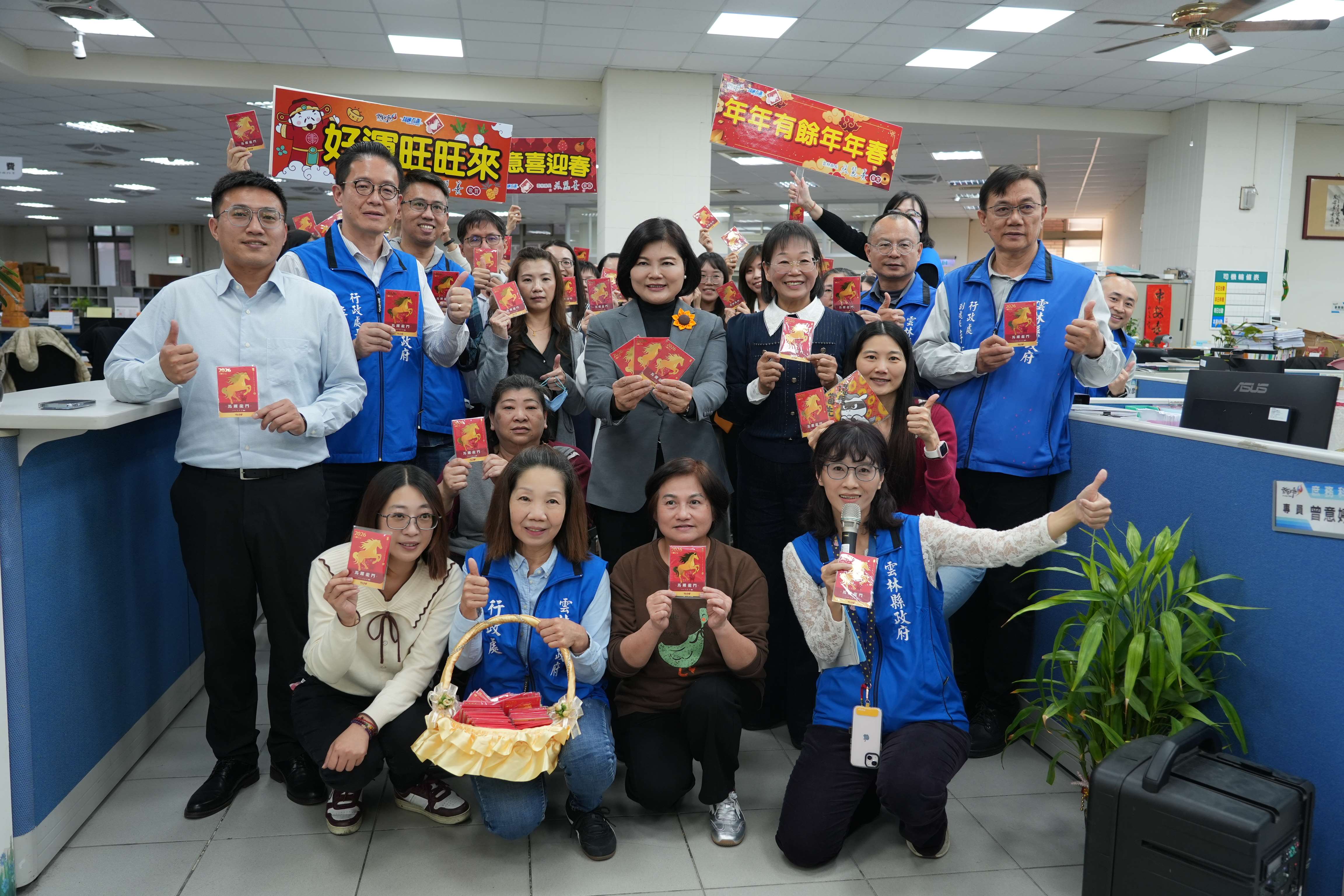 春節將屆,雲林縣長張麗善12日偕副縣長謝淑亞、陳璧君,在行政處長李重毅陪同下,前往縣府各局處發送新春福袋,向全體同仁拜早年,感謝一年來為縣政打拚的辛勞與付出,並祝福大家馬年「馬上平安、馬上幸福、馬上健康、馬上快樂、馬上發大財」。