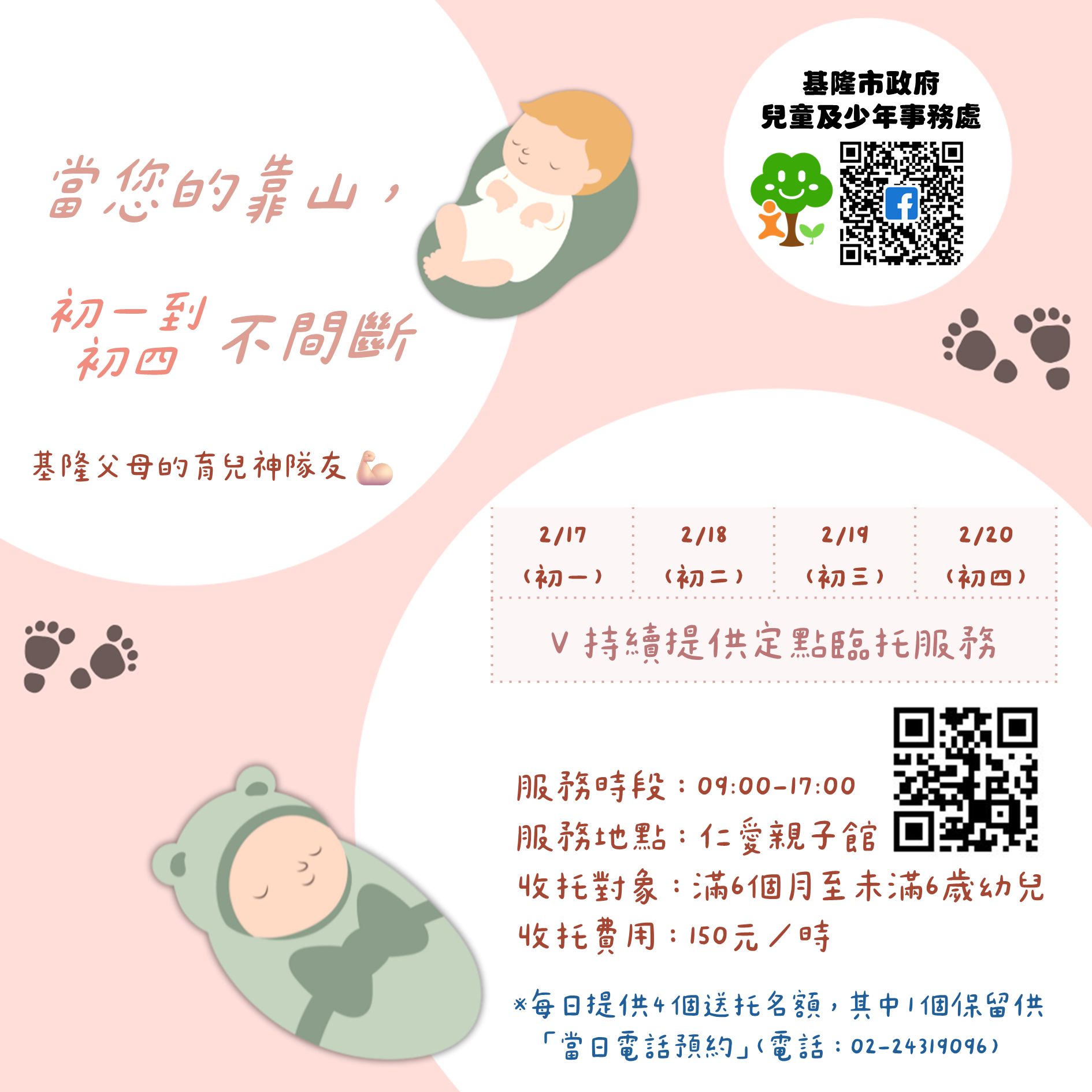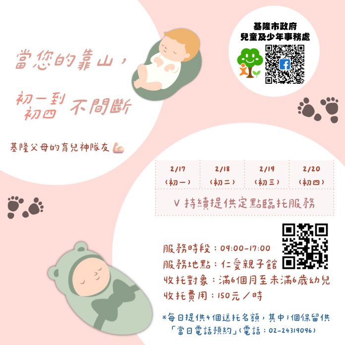 為因應春節連假期間的臨時托育需求,減輕家長的育兒家庭照顧壓力,基隆市政府兒童及少年事務處貼心規劃,將於2月17日至2月20日(農曆年初一至初四)推出「春節兒童日間定點臨時托育服務」,讓家長在返鄉、團聚或臨時行程安排時,仍能獲得即時且安心的托育協助。