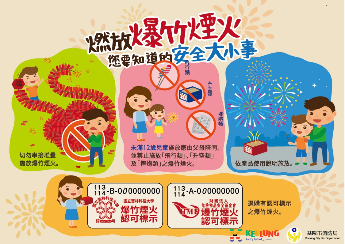 統計近3年農曆春節計發生24件火災案件,以電氣因素火災9件最多,其次為爐火烹調不慎3件及燃放爆竹3件居次。春節期間使用火源、電器及燃放爆竹煙火機率增高,請市民朋友應注意用電、用火安全,當您要出遠門時最好還是順手檢查一下居家的用火用廚具的情形,時時注意『人離火熄』就對了!(使用延長線不可重壓!、居家使用的線路如有發燙或異味產生,應立即停止使用該高電量之電器喔) 在施放爆竹煙火的安全部分,必須選購有合格標示之爆竹煙火,不得讓幼童獨自燃放爆竹,以免受傷;提醒在過年期間會有寒流侵襲,溫差變化極大、氣溫驟降,民眾使用燃氣熱水器及瓦斯爐具時應特別注意安全及保持通風,避免一氧化碳中毒,才能平安歡渡春節。