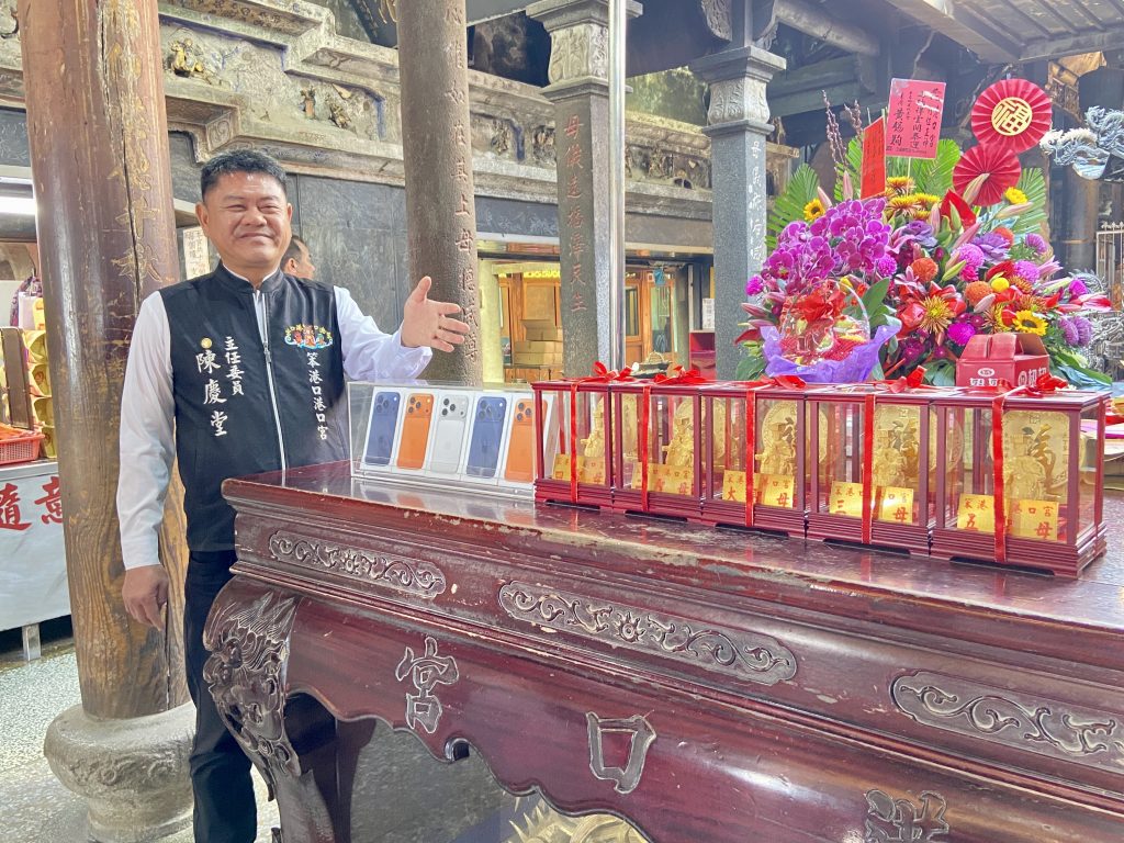農曆年節連假今天起跑,嘉義縣東石港口宮循往例在過年期間舉辦「擲筊送轎車活動」,今年大獎分別為80多萬元和60多萬汽車各1輛,尤其近期金價高漲,5尊金媽祖每尊造價逾10多萬,加上5台iPhone17、多輛機車、還有其他豐富大獎,從大年初一到初五每天在大殿前廣場舉行,添香油錢1000元可參加1次搏轎車擲筊,100元可參加1次搏金媽祖、手機擲筊,主委陳慶堂今(14)日熱情歡迎全國善男信女來東石港口宮參拜、試手氣。