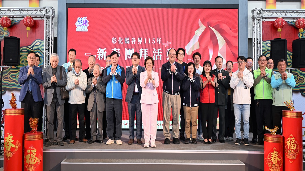 2026馬躍騰達,福滿彰化!彰化縣政府於23日上午在縣府中庭舉辦彰化縣各界115年新春團拜活動,由彰化縣長王惠美主持,邀集民意代表、士農工商、文化及各界代表齊聚一堂,共賀新春、暢談未來,現場氣氛熱絡。王縣長親自向與會貴賓及縣府同仁致上新春祝福,感謝大家多年來攜手打拼,並祝福新的一年政通人和、風調雨順、五穀豐登、百業興旺、人和家順,士農工商都有好發展,各行各業一路發發發,一馬當先、馬到成功、馬上健康、馬上幸福,平安順利!