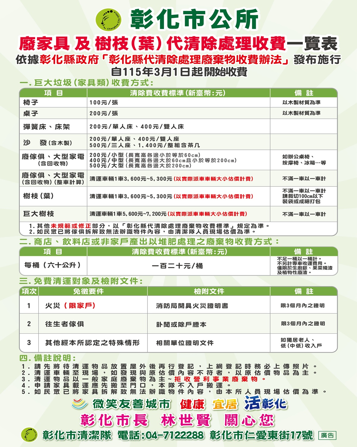 在廢棄物清運方面,彰化市將於 3 月 1 日起,依照「彰化縣代清除處理廢棄物收費辦法」對大型家具(如衣櫃、沙發、床架)及彈簧床進行收費。
