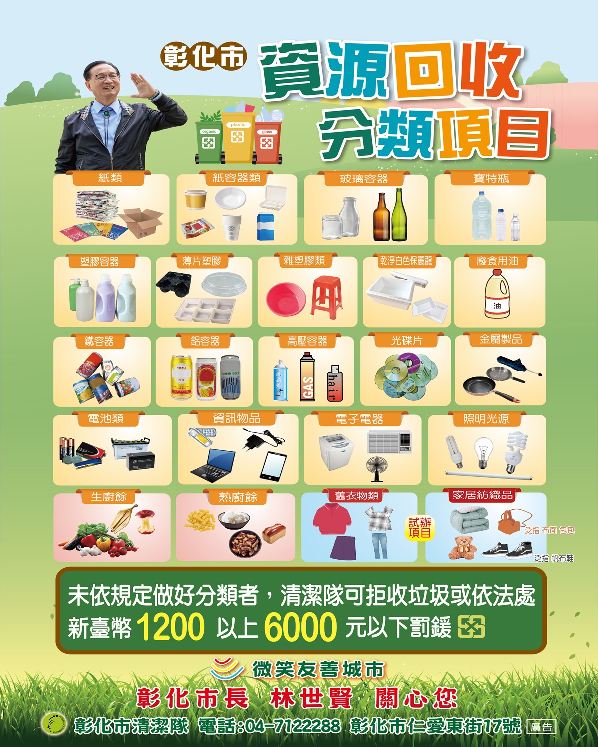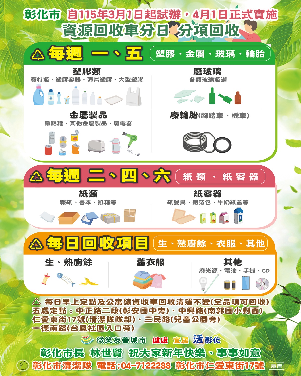 彰化市資源回收量長期居全縣之冠,隨之而來的分類壓力日益沈重,為維護城市環境品質並落實職場安全,彰化市公所自115 年 3 月 1 日起正式推動兩項重要環保新制:一、資源回收品採「分日、分項」收運;二、依法針對大型家具包括彈簧床收運實施收費,以符合使用者付費公平原則。