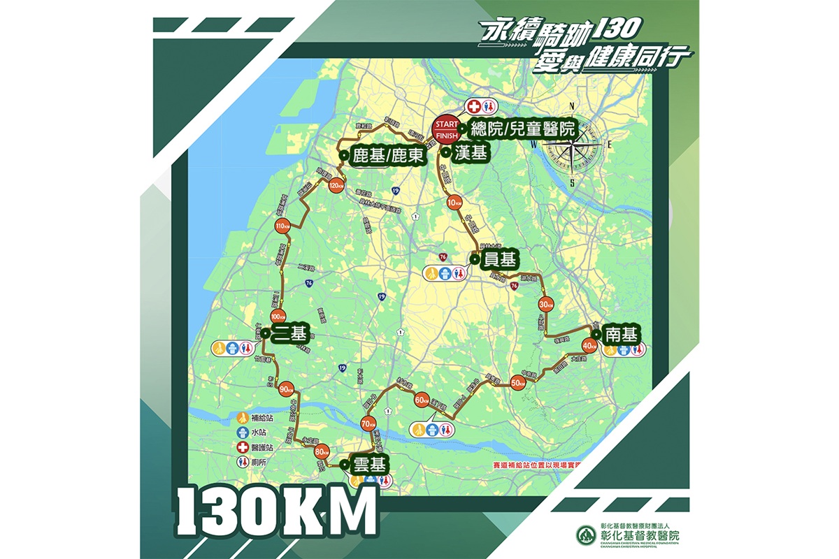 此次活動特別規劃 30 公里與 130 公里兩組路線。130K 挑戰組象徵 130 週年,由總院出發,串聯體系分院,包括:兒童醫院、員林基督教醫院、南投基督教醫院、雲林基督教醫院、二林基督教醫院、鹿港基督教醫院、鹿東基督教醫院及漢銘基督教醫院,沿途主管迎接同仁,溫馨畫面象徵體系一家親。