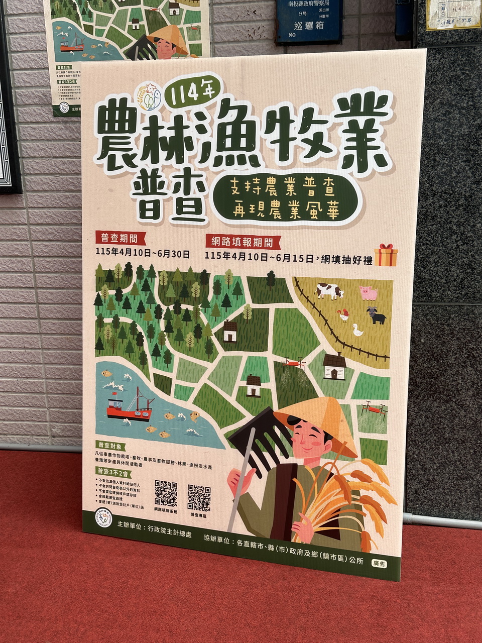 王副縣長指出,根據統計法規定,農林漁牧業普查是每5年辦理1次的基本國勢調查,自民國45年創辦以來,已是第15次辦理,由於普查規模龐大,所需動員的人力約500人左右。「114年農林漁牧業普查」將採二階段方式蒐集資料,第一階段於4月10日至4月30日,由行政院主計總處寄發致受訪戶(單位)函,民眾收到通知函後可自行上網填報;第二階段於5月1日至6月30日,由縣府及各鄉鎮市公所派員實地訪查。