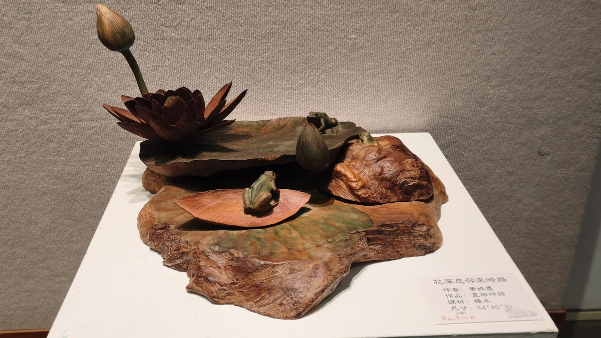 本次展覽回顧黃老師六十年創作歷程,題材多元,其中以蓮花系列作品最具代表性。透過長年觀察自然生態與生活景致,並不斷精進構圖與技法表現,使原本質地堅硬的木材轉化為姿態生動、層次細膩的藝術作品,展現蓮花清淨堅韌之意象,深獲各界好評。