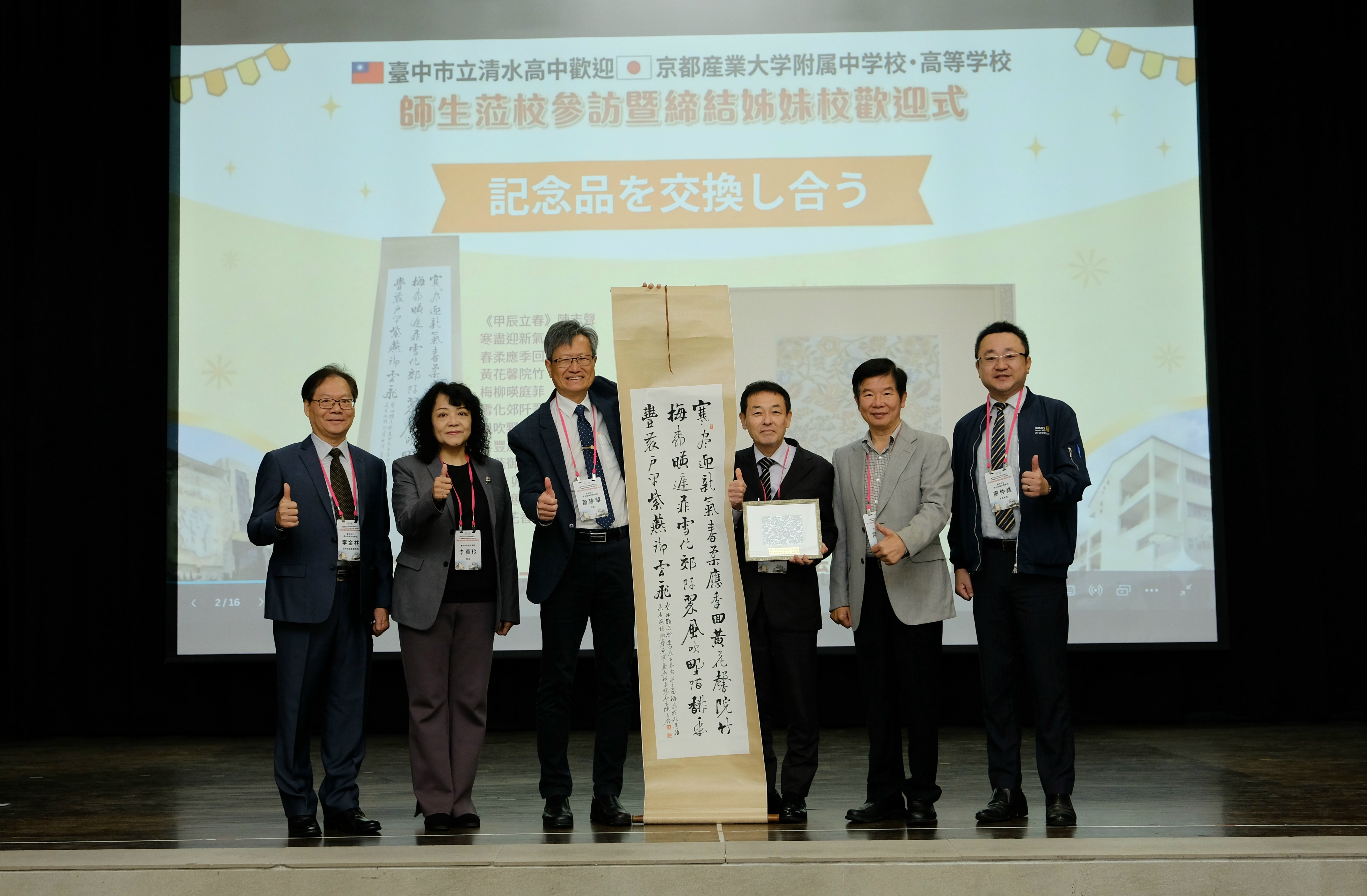 文化藝術交流亦是本次締盟的重要亮點。清水高中致贈由書法家陳志聲創作的《甲辰立春》書法作品,作為友誼象徵,並由其親自介紹書法藝術之美。日方則回贈以京都傳統工藝「西陣織」裝裱的藝術作品。兩件藝術品分別展現中華書法的深厚意境與日本傳統織藝的精緻工藝,象徵兩校情誼如經緯交織、長久延續,也寄託對未來合作的美好祝福。京都素有「千年古都」之稱,孕育西陣織、友禪染與清水燒等傳統工藝,文化底蘊深厚。透過此次藝術品互贈,不僅展現臺日文化交流的深度,也讓學生更貼近彼此的文化特色。