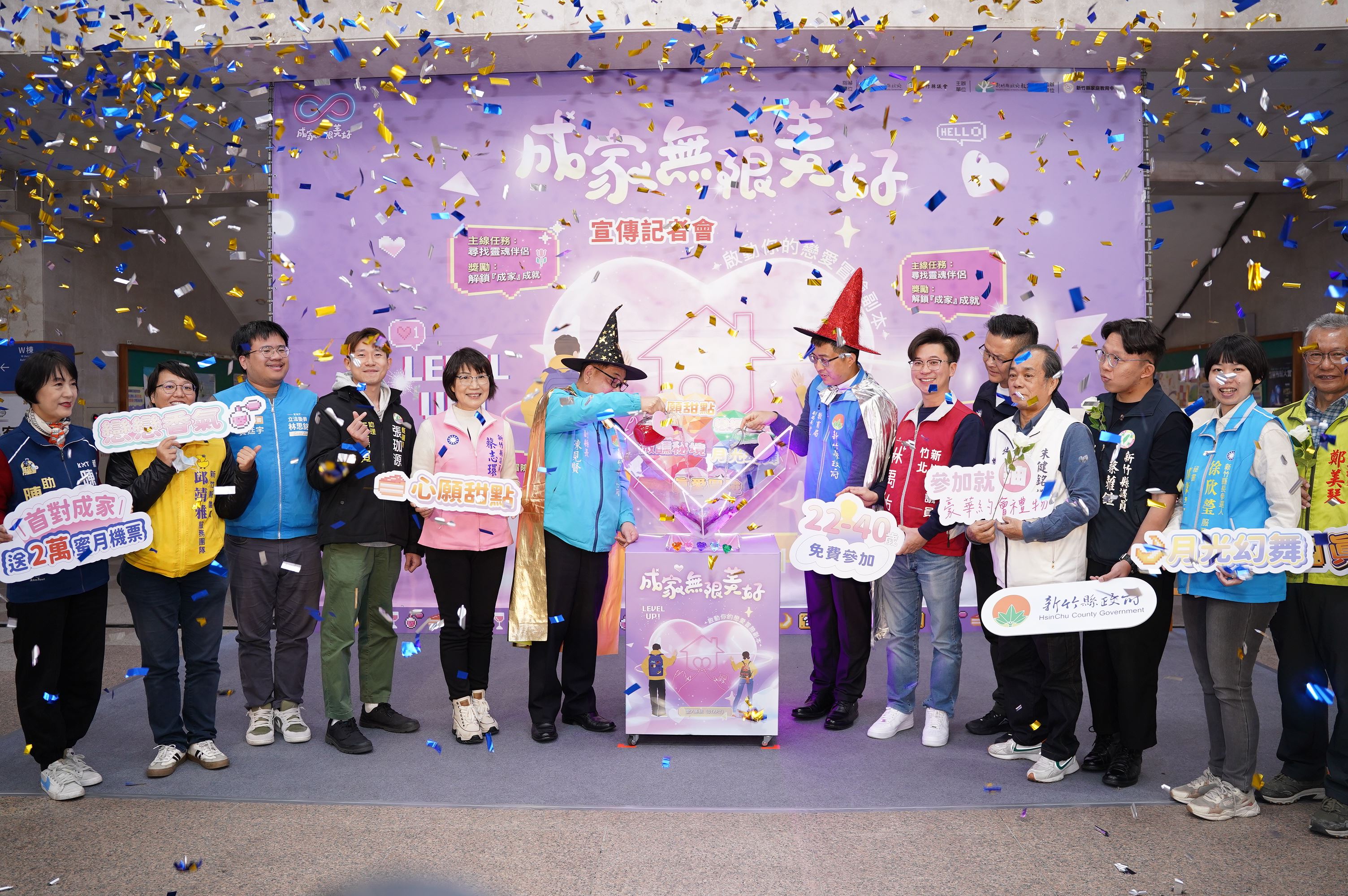 新竹縣「協助青年成家系列活動」邁入第5年,今年縣府帶領竹縣單身青年開啟全新「戀愛冒險副本」,今(13日)特別於白色情人節前夕在縣府大廳舉辦宣傳記者會,邀請金鐘獎入圍主持人劉于慈(魚兒)甜美開場,由2025日本國際花式調酒大賽冠軍陳武良化身「幸福鍊金術師」,精彩調酒秀為年度任務揭開序幕,副縣長陳見賢與貴賓共同注入「心動能量」,點亮盛裝5大精彩活動副本的愛情魔法杯,宣告年度系列活動正式啟動。