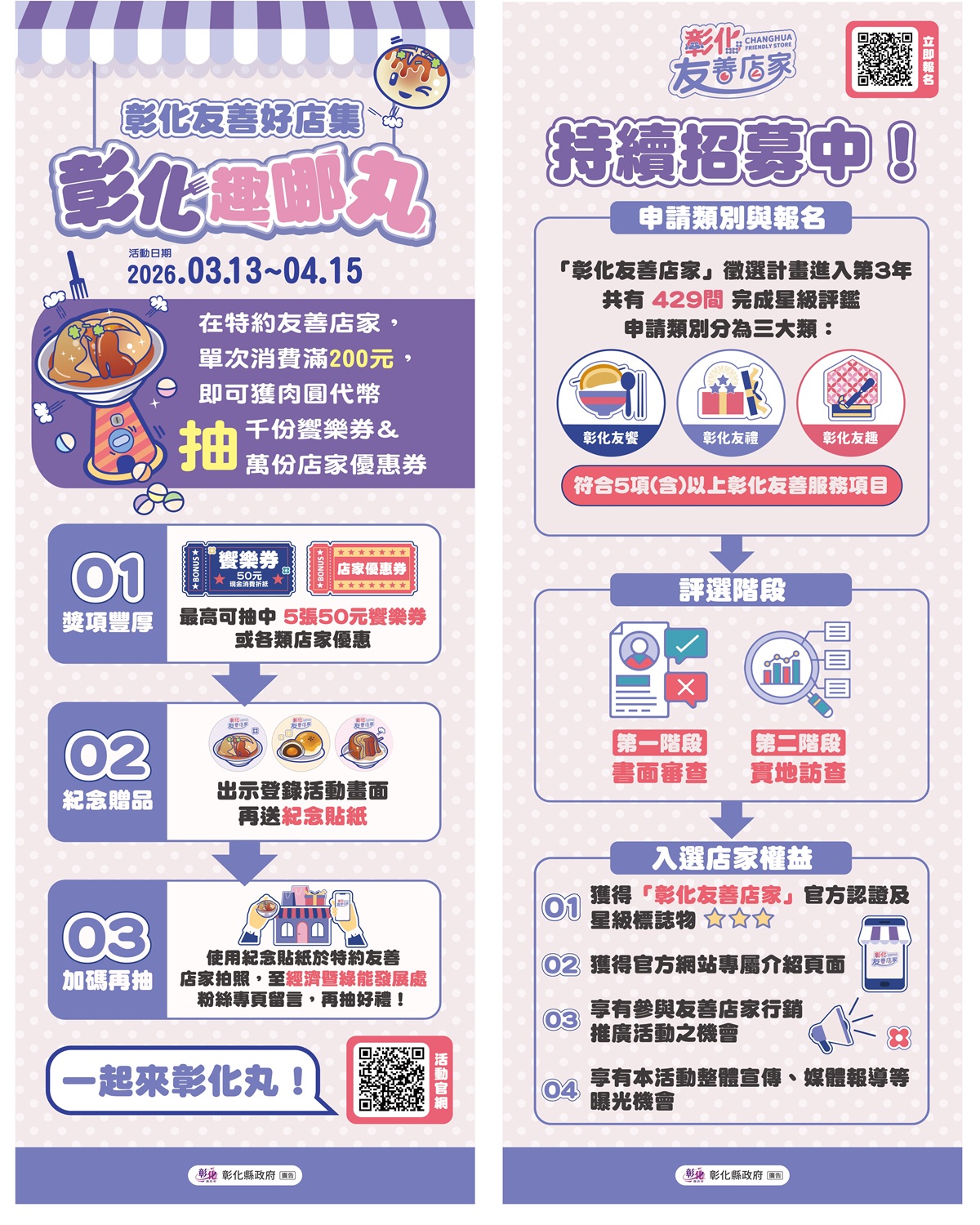 未來將持續透過店家串聯、空間改造及創意行銷等方式,強化在地品牌特色,讓彰化成為兼具友善服務與永續發展的魅力城市。今年春天,也歡迎民眾用實際消費支持喜愛的友善店家,一起感受彰化的熱情與溫度。