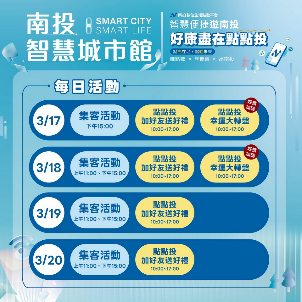 2026智慧城市暨淨零城市展(Smart City Summit & Expo/Net Zero City Expo)3月17日至3月20日在台北南港展覽館盛大登場,南投縣府以「數位轉型」與「永續發展」為雙軸心,重磅打造「南投智慧城市館」,透過具體政策讓各界見證南投如何以宏觀視野運用智慧科技深化治理,精準解決偏鄉醫療與交通痛點,讓科技成為守護縣民的溫暖力量。集客快問快答可獲好禮。