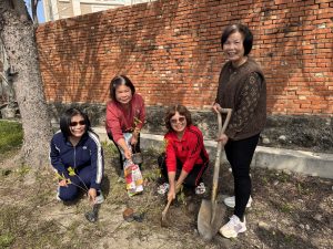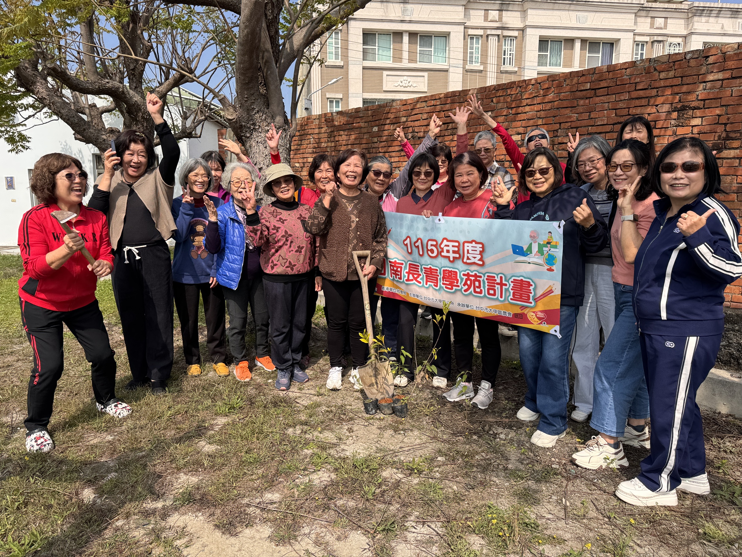 昨日在陽光和煦的天氣下展開,長者們在工作人員引導下分工合作,拿起鏟子挖土、培土並栽種樹苗,現場氣氛熱絡、笑聲不斷。此次種植的植物包含山櫻花、山梔、杜鵑、七里香、羅漢松及朱槿等多樣花木,不僅為苑區增添自然景觀,也營造更加舒適宜人的學習環境。