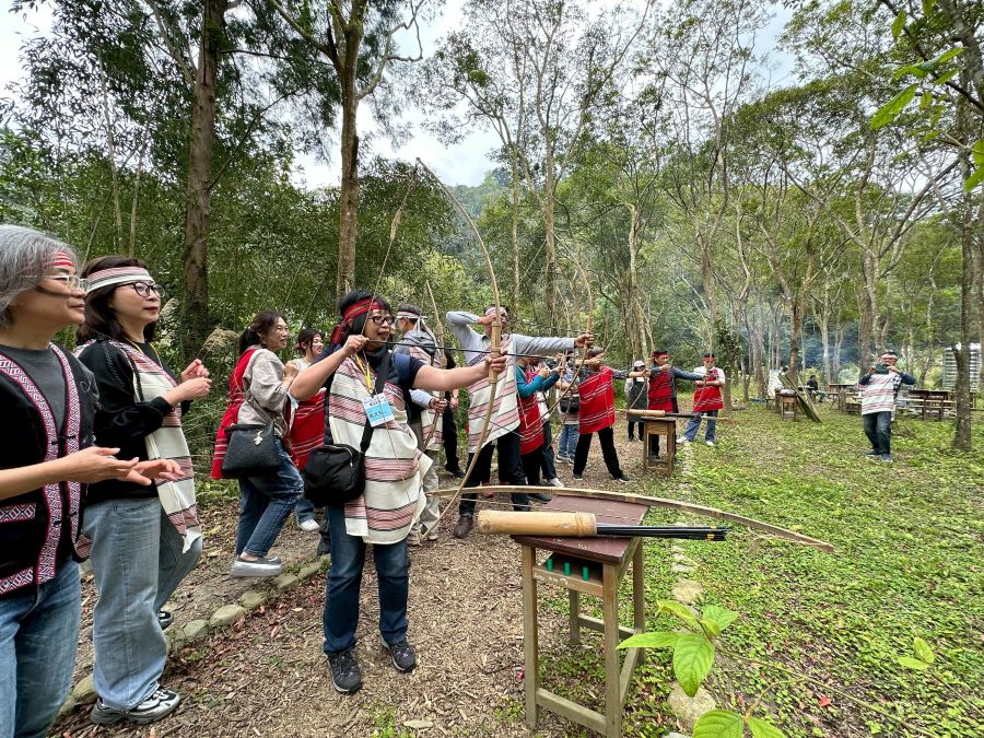 這次走讀活動由南江休閒農業區發展協會理事長陳黃光達、在地部落青年,以及優質場域設計團隊共同導覽,分享農村再生導入優良環境營造後為場域引動注入的教育內涵與永續理念。活動首先由南江休閒農業區發展協會理事長陳黃光達和部落青年帶領學員換上原住民族傳統服飾,接著步行僅需1分鐘,即進入如自然山林般的南庄獵人學校場域,在森林芬多精環繞下,體驗野菜辨識、陷阱狩獵與箭術等原民傳統知識。透過沉浸式的山林體驗,讓參與者得以深入認識部落生活文化與原民風情,並感受當地所倡議的慢食、慢遊、慢活「國際慢城」生活節奏。