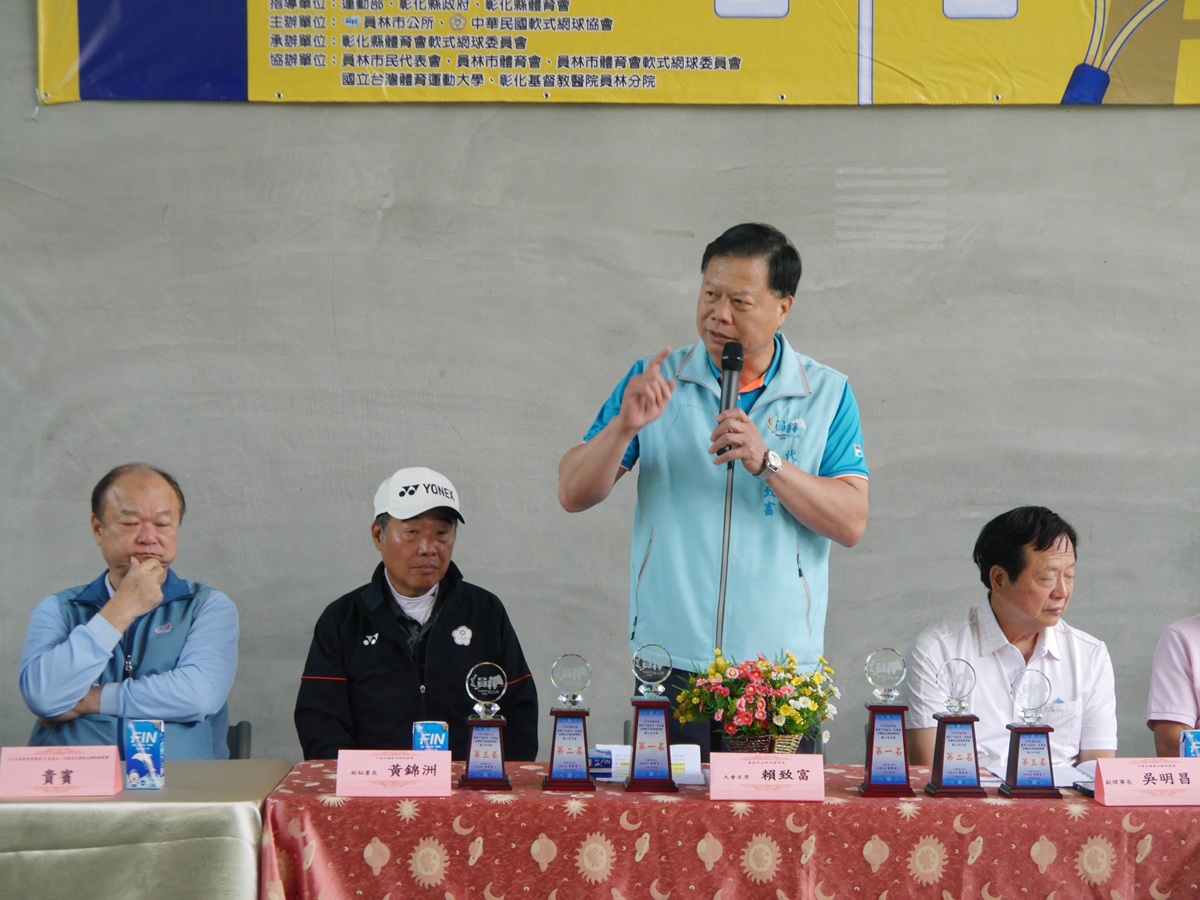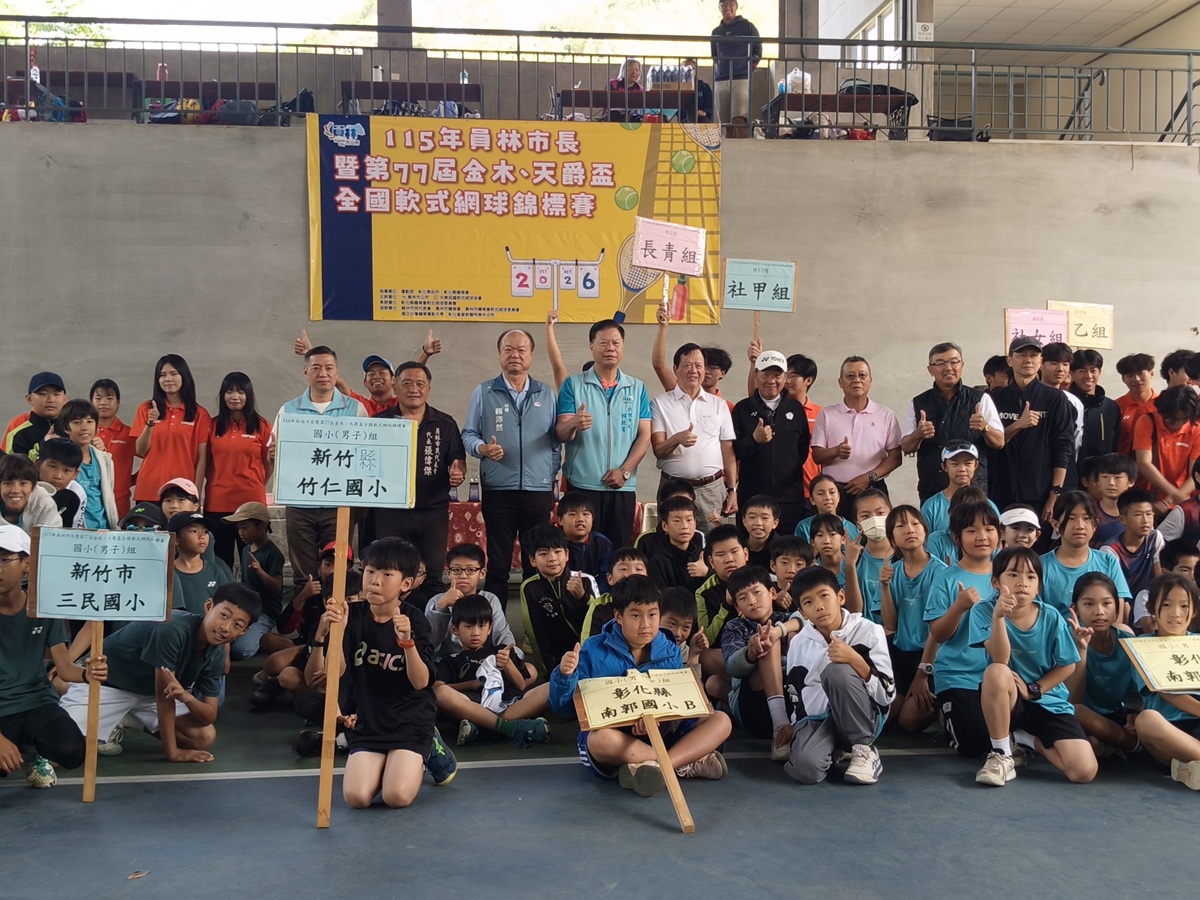 微風徐徐、天氣晴朗,員林市公所於今日上午特別在員林運動公園網球場連續二天舉辦「115年員林市長暨第77屆金木、天爵盃全國軟式網球錦標賽」,由員林市代理市長賴致富、市民代表會代表張偉傑、彰化縣政府秘書賴沛然、中華民國軟式網球協會副理事長吳明昌、副秘書長黃錦洲;彰化縣軟式網球委員會總幹事陳浩裕、副總幹事張勝發;員林市體育會軟網委員會主委陳世邦等貴賓到場為來自全國各地好手加油打氣,期待其等能爭取佳績,為校爭光。