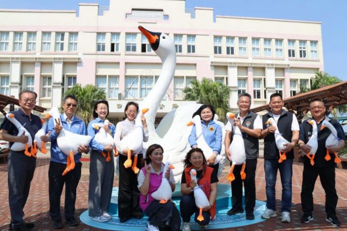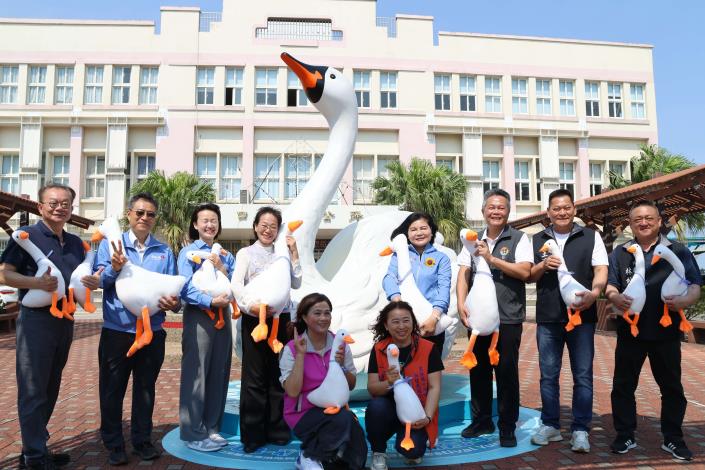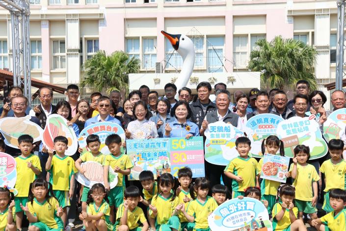 張縣長指出,活動期間除了8米高巨型天鵝裝置藝術外,還有精彩的舞台表演、親子互動體驗、市集美食及生態導覽等豐富內容。更串聯在地農畜產資源,假日不僅有每日限量1,500份的100元『鵝樂券』免費發放,還有每日1,000份鵝肉料理(鵝肉粽、鵝米糕等)試吃,希望讓更多民眾實際品嚐到雲林優質的鵝肉產品。
