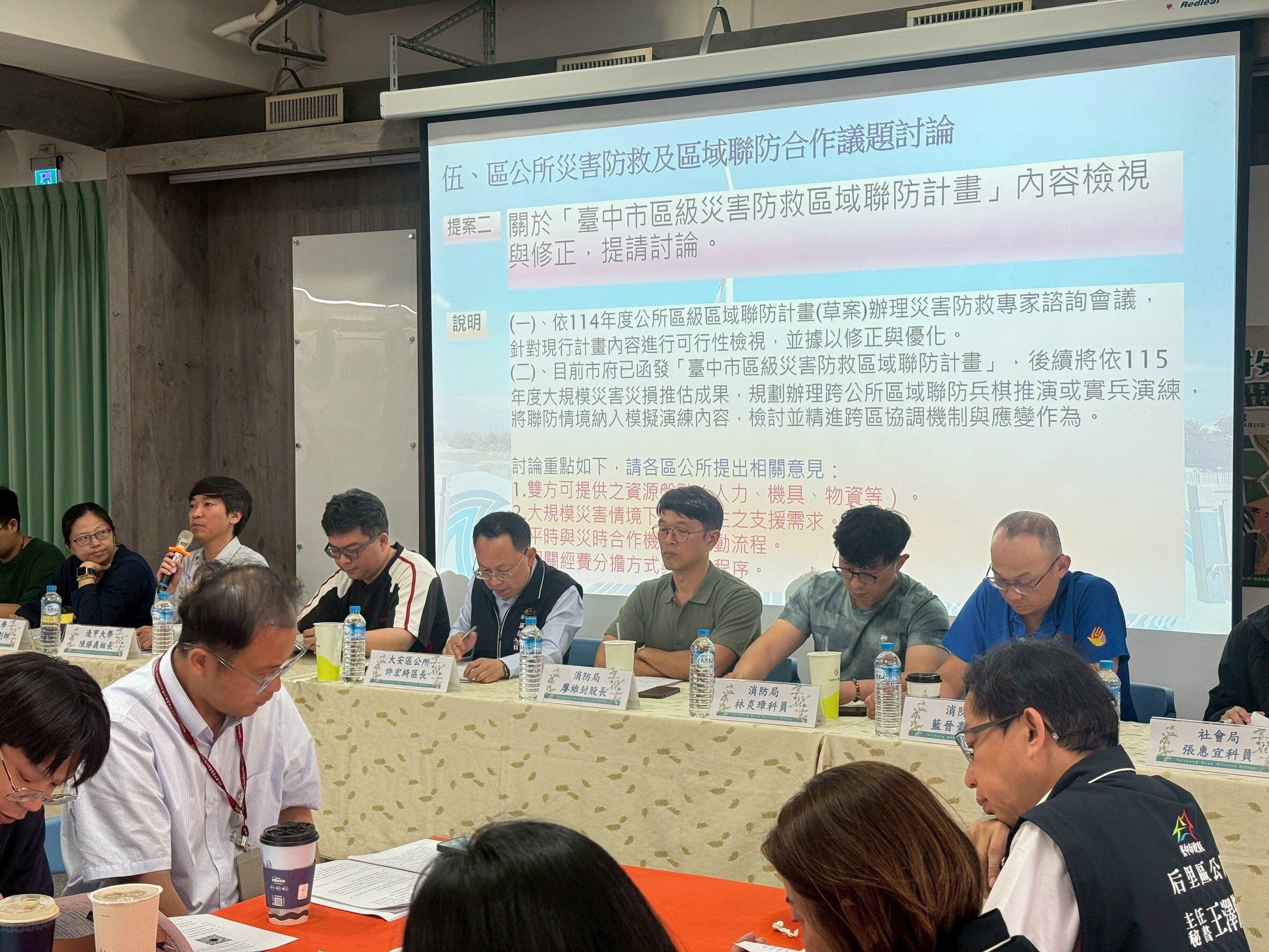 風災及震災之應變會議由區長許宏綺主持,邀請臺中市政府消防局、民政局、社會局、水利局及逢甲大學莊永忠教授率領的團隊蒞臨指導。此外,相鄰的大甲區、外埔區與后里區公所也派員共同參與會議,針對大規模災害可能帶來的衝擊進行深入探討,並就災前整備、災中應變及災後復原等面向進行經驗分享與意見交流。