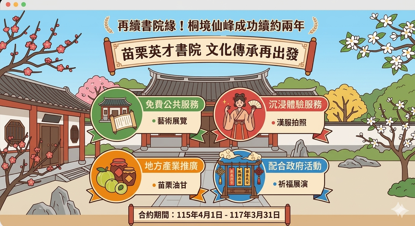 為持續推動地方文化資產的活化與運用,苗栗縣政府宣布位於後龍的高鐵特定區知名景點「英才書院」,其部分場館(販賣部、2間講學堂及2間展示館)之標租營運,將由原營運單位桐境仙峰有限公司成功續約兩年,合約期自115年4月1日起至117年3月31日止。