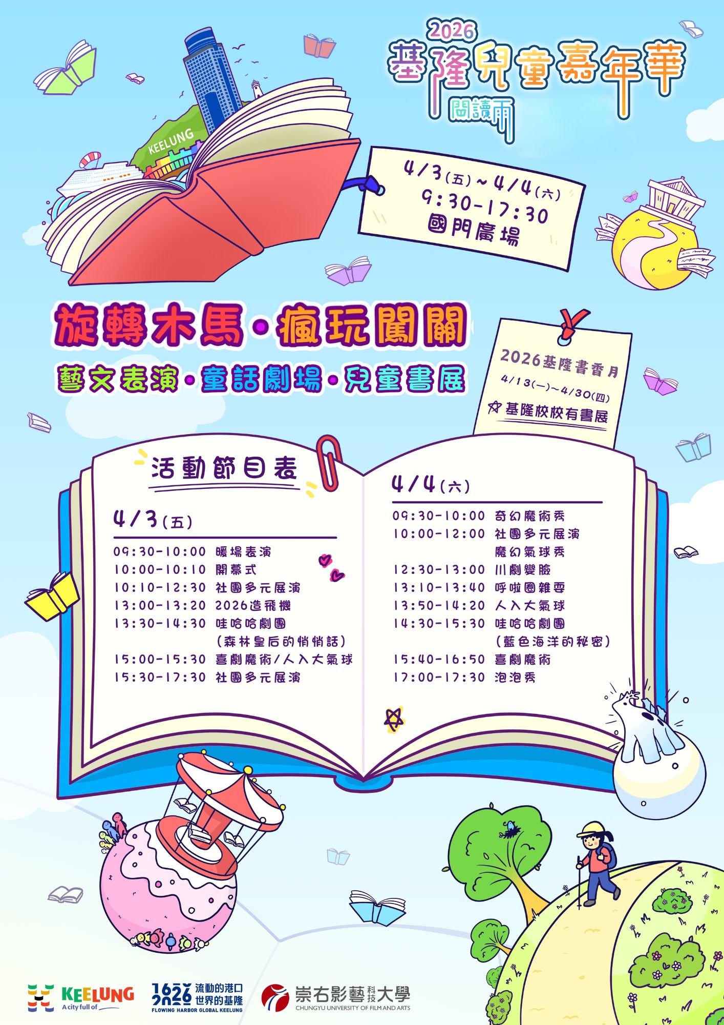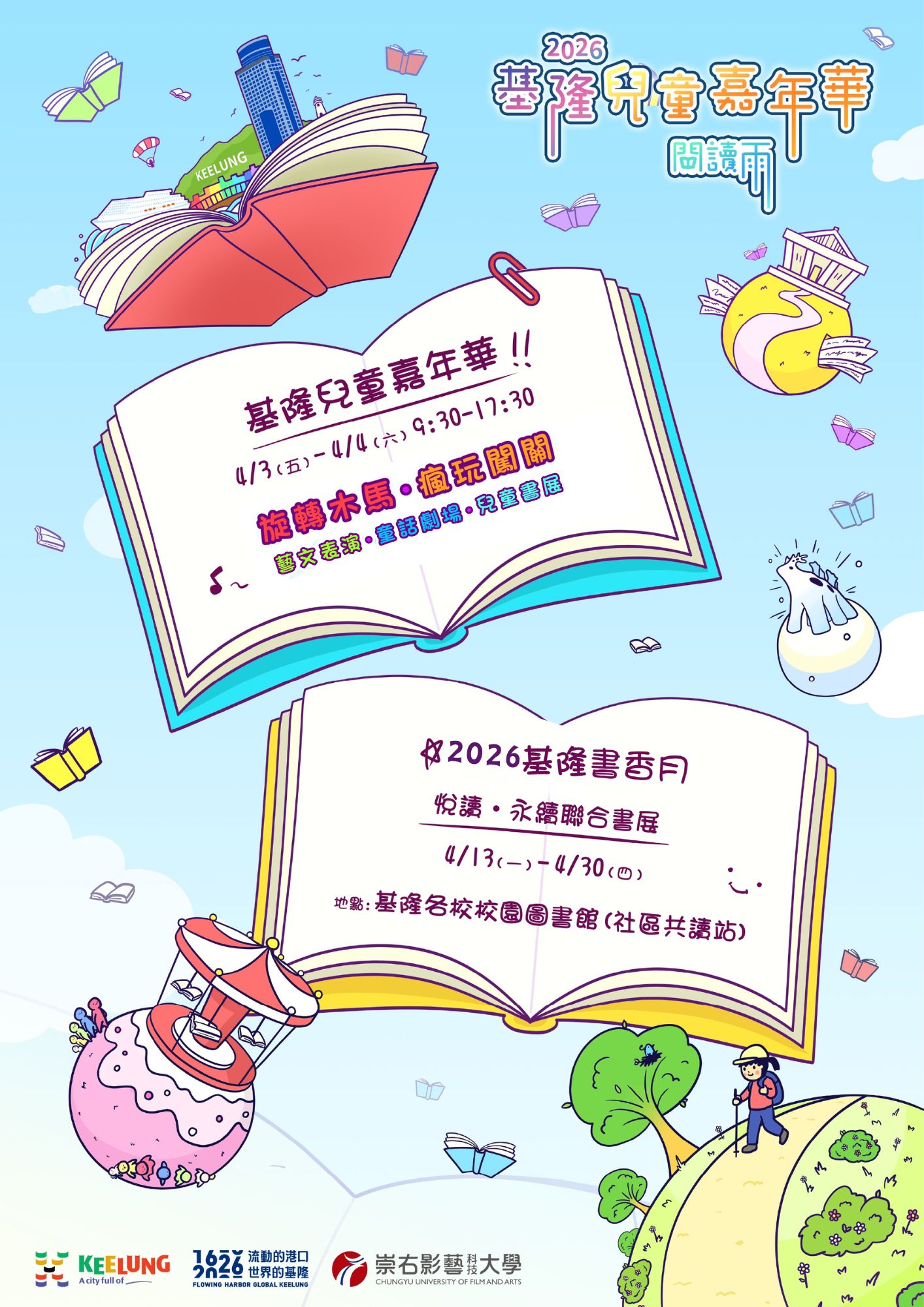 本次兒童節為了讓孩子透過多元體驗活動,本府展開4月3日與4日「2026基隆兒童嘉年華~閱讀雨」及4月13日至30日全市51校圖書館「2026基隆書香月」等系列活動。誠摯歡迎全國家長和小朋友走訪基隆,一同參與「2026基隆兒童嘉年華~閱讀雨」和「2026基隆書香月」活動,在基隆留下美好的童年回憶。