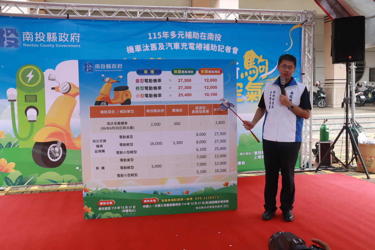 環保局長李易書簡報說明,南投縣114年底尚有老舊機車約52,474輛,減少老舊機車的空污排放,一直是空氣污染防制工作的重點,今年度汰舊換購電動機車補助金額提高,加上中央的補助,民眾有機會可領到最高27,300元的補助。至於新購電動機車部分,環保局補助5,000元,加上經濟部產業發展署補助,最高則有12,000元的補助。而單純淘汰老舊機車不分二、四行程,環保局全部補助每輛2,500元,加上環境部補助300元,合計最高有2,800元的補助。