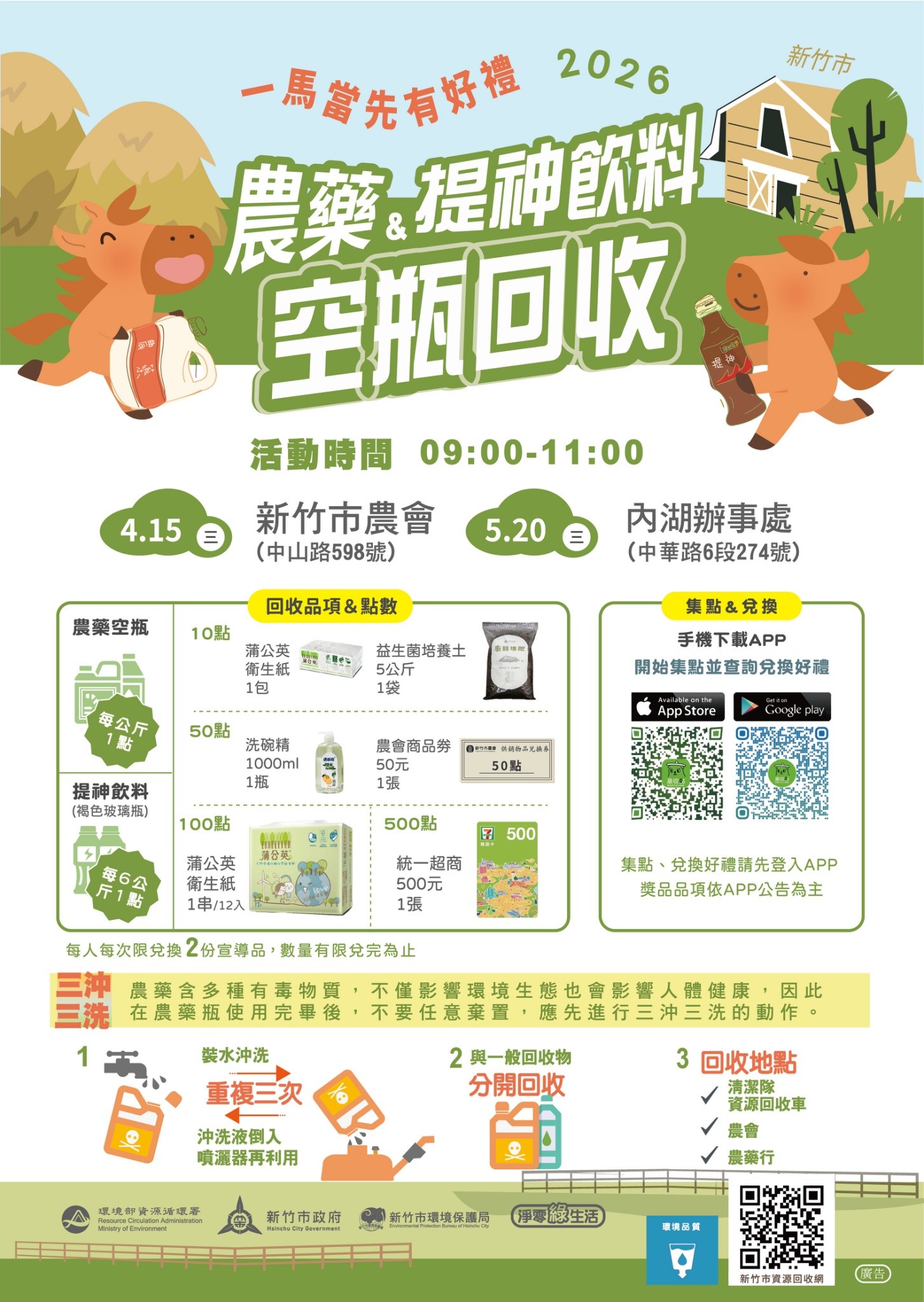 為持續推動淨零綠生活、打造宜居永續城市,新竹市環保局啟動「春季農藥空瓶與提神飲料玻璃瓶回收行動」,將於今(115)年4月15日在新竹市農會(中山路598號)及5月20日於內湖辦事處(中華路6段274號)辦理,共計兩場次。環保局表示,此次活動時間為9時至11時,號召農民與市民踴躍參與,將耕作後的農藥空瓶與勞作後的提神飲料玻璃瓶妥善回收、轉化為環保資源,凡攜帶兩類指定回收物,即可透過「風收站APP」累積點數並兌換好禮,以實際行動落實資源循環。