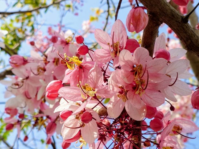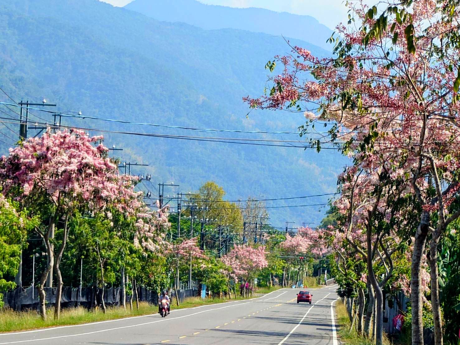 高雄市六龜區台27甲線兩側的花旗木近日進入盛開期,綿延數公里的粉色花海與周邊山景相互映襯,形成有「平地櫻花」之稱的季節景觀,吸引不少民眾前往賞花、拍照,成為六龜春季限定的風景亮點。