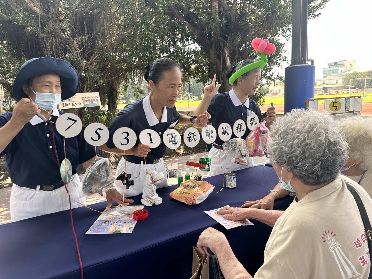 為了照顧鄉親多元需求,現場設置了宛如小型診所的複合式義診區,包含家醫、中醫及領藥服務,解決偏鄉就醫奔波的痛點。除了身體診察,現場也安排趣味的環保闖關,志工以簡單口訣「瓶瓶罐罐紙電1357」,引導長者將健康與環保理念融入日常。
