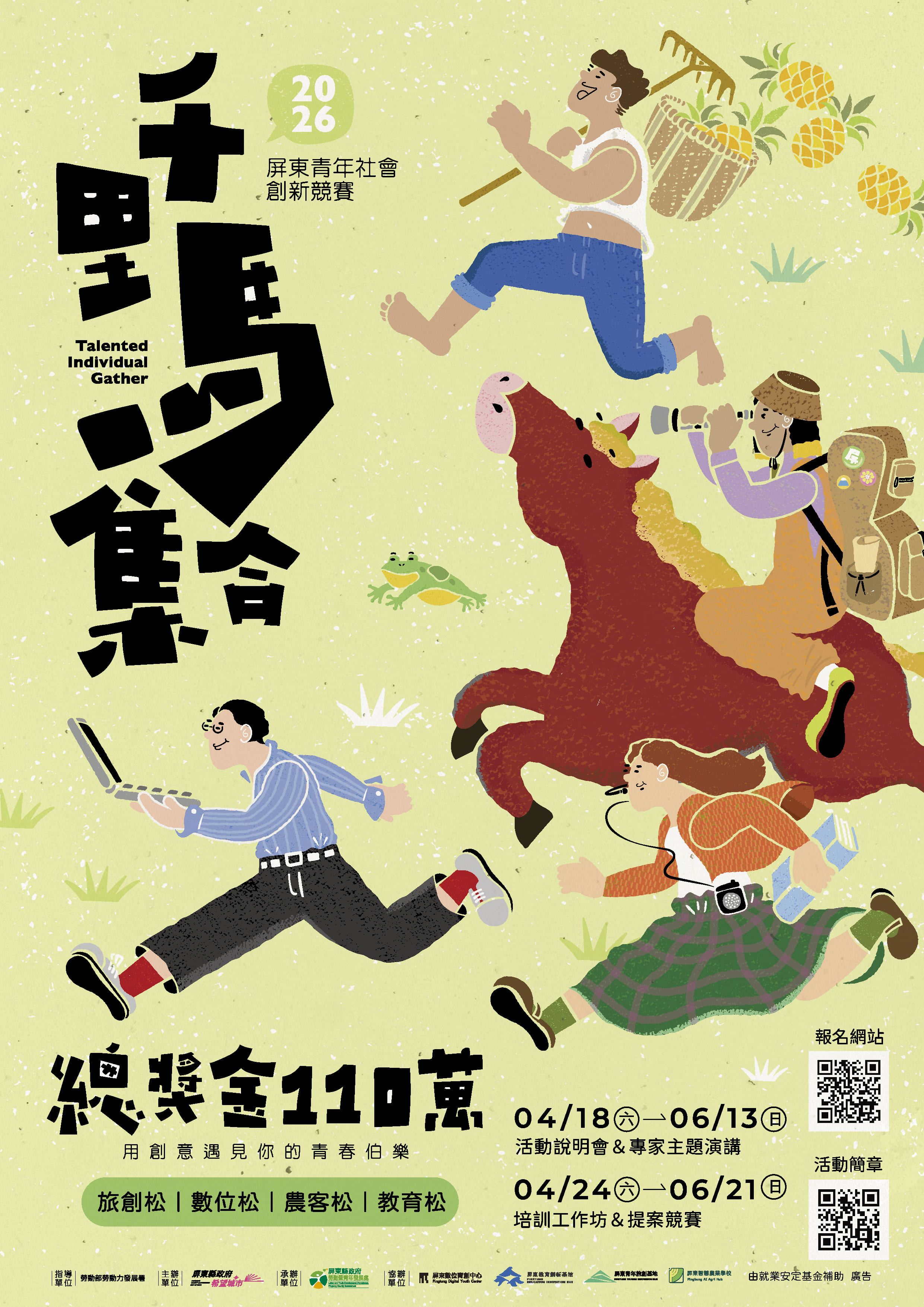 屏東縣政府持續推動青年返鄉與地方創生,今年再度推出年度指標性競賽「千里馬集合!2026屏東青年社會創新競賽」,邀請全台青年帶著創意與行動力,透過提案實作與跨域合作,讓創意不只停留在想像,而是真正落地實踐。