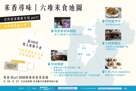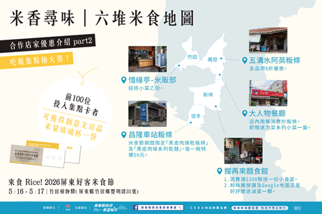 此外,集滿三家店家點數並於5月16、17兩日至活動會場參加抽獎,有機會可以把人氣好禮帶回家,前100位投入集點卡民眾,還可兌換限量米量馬克杯,誠摯邀請全國民眾走進六堆,用一碗米食認識一段故事,在香氣與人情味中,提前感受「2026屏東好客米食節」的熱鬧與魅力,活動相關資訊請參閱屏東縣政府客家事務處粉絲專頁。