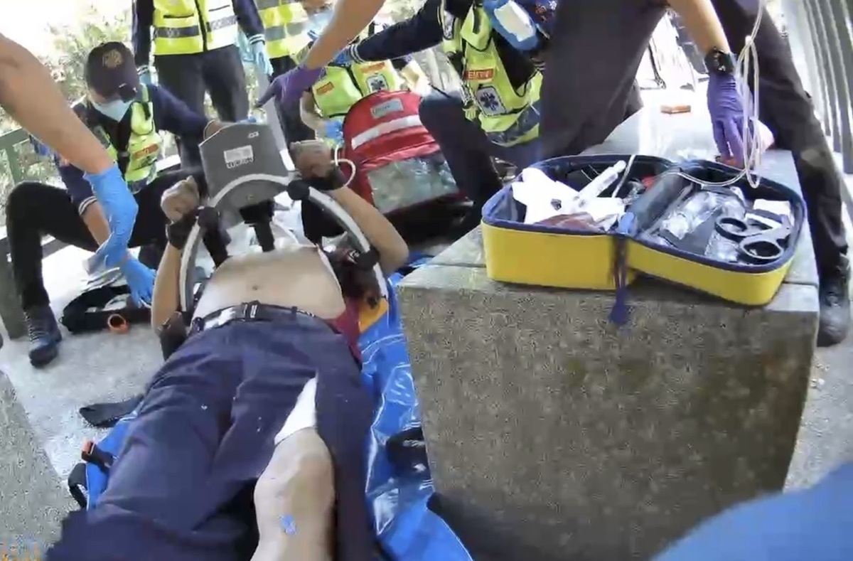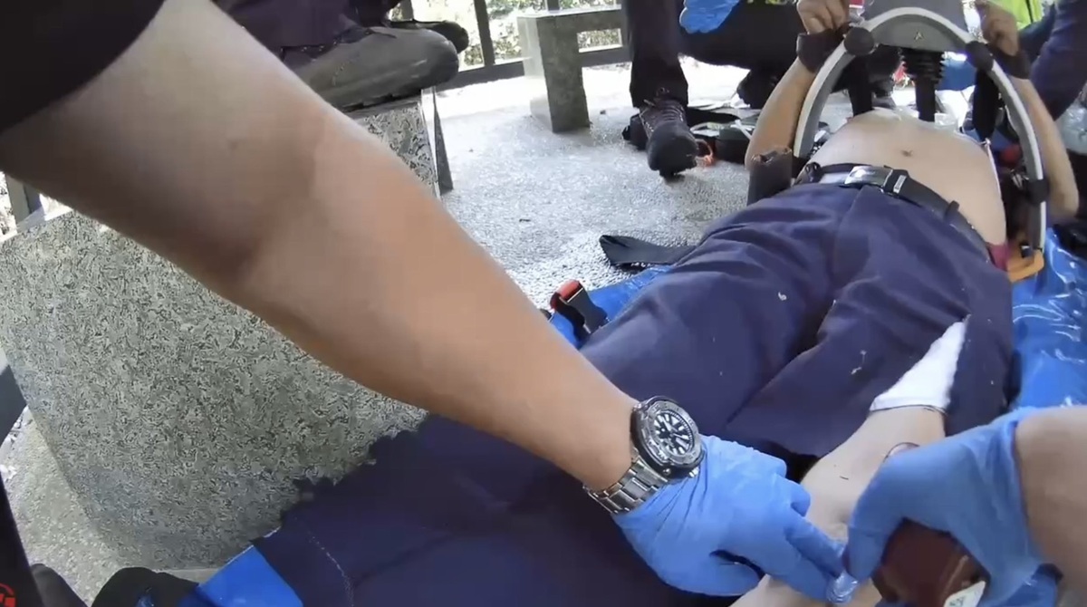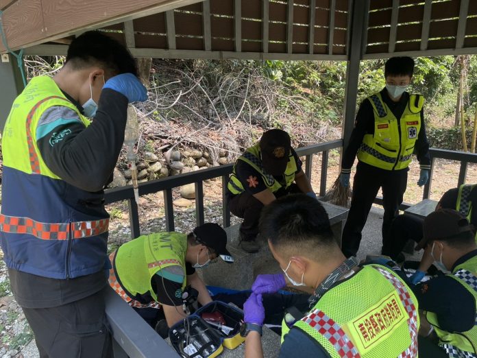 4月12日上午10時左右,南投縣政府消防局119勤務中心首先接獲報案,稱芬園鄉挑水古道有民眾倒地。現場友人第一時間撥打119求救,並在派遣員的指導下立即實施心肺復甦術(CPR)。消防局考量患者可能需要長距離搬運,因此派遣3輛救護車及9名救護技術員出勤。由於轄區位於彰化縣,因此立刻轉報彰化縣消防局,得知為OHCA患者,彰化縣也立刻派遣芬園分隊1名高級救護技術員及2名救護技術員出勤,形成現場12位救護人員聯手急救1位患者的特殊場景。
