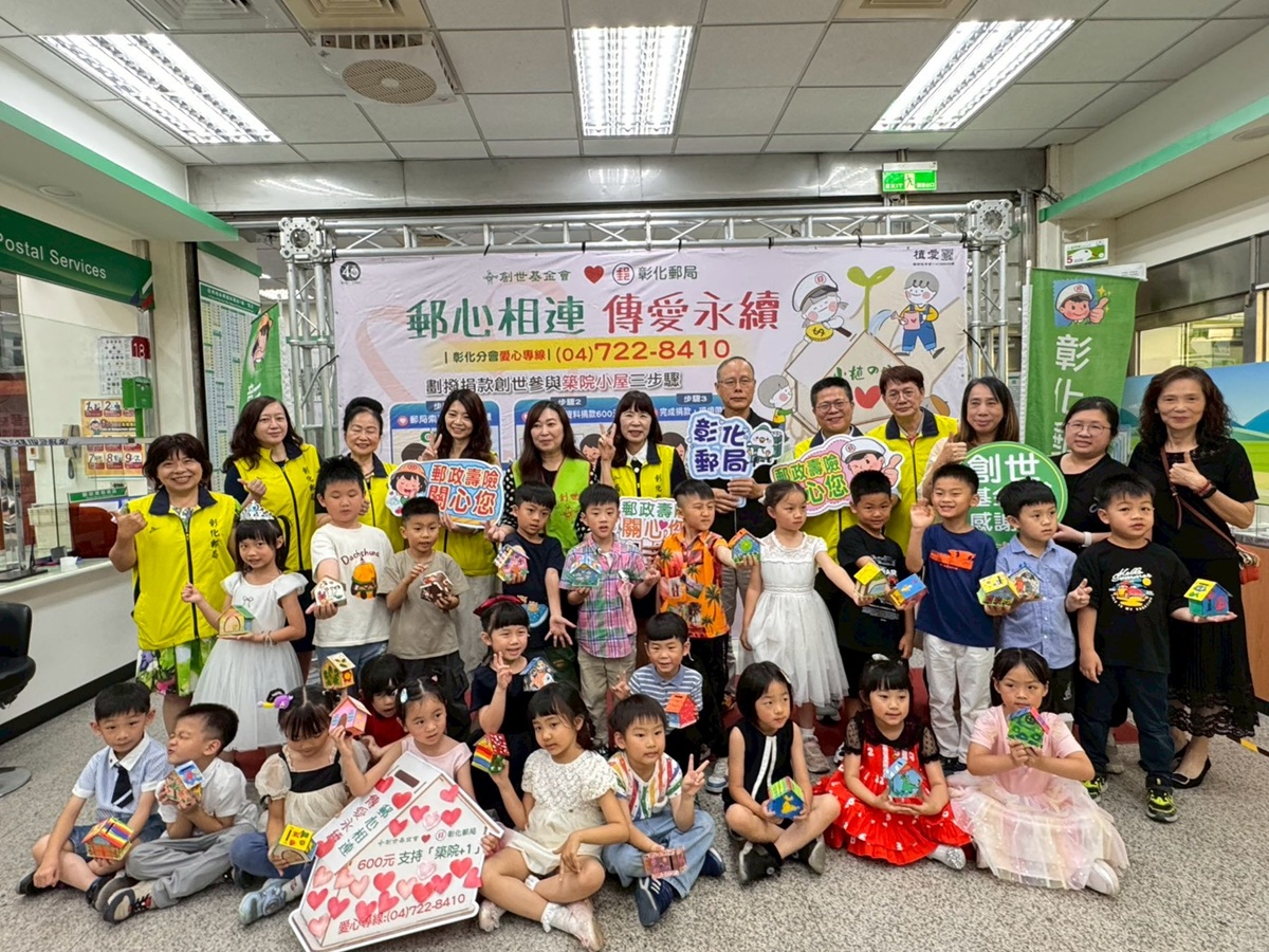 彰化郵局啟動「郵心相連 傳愛永續」公益活動,積極響應社會公益、關懷弱勢,此次攜手創世基金會彰化分會,共同推動嘉義新院擴建,展現郵政體系深耕地方、串聯愛心、回饋社會的溫暖力量。今(15日)於彰化郵局舉辦媒體說明會,平和非營利幼兒園小朋友以活力四射的舞蹈熱鬧開場,並化身小小設計師,手持自己彩繪的「築院小屋」自信走秀,繽紛色彩與童趣創意交織,一筆一畫都是對公益的詮釋,畫面可愛動人。